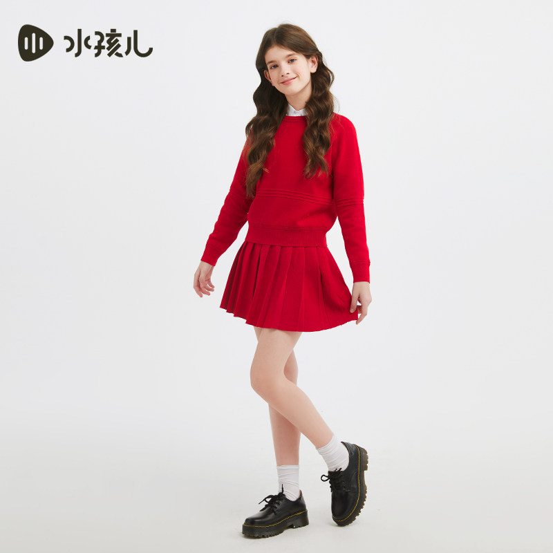 水孩儿童装女童套裙春秋季新品红色针织衫毛衣半身裙女孩两件套
