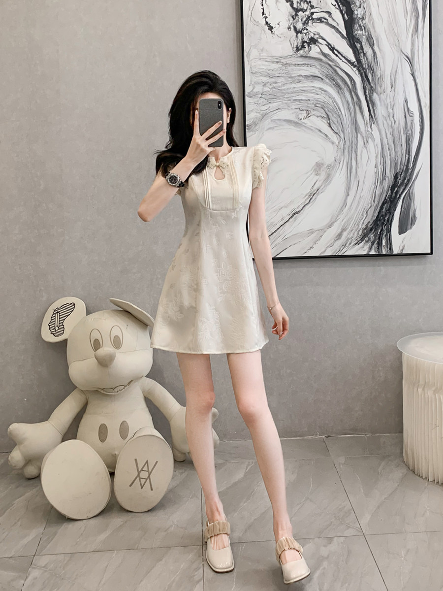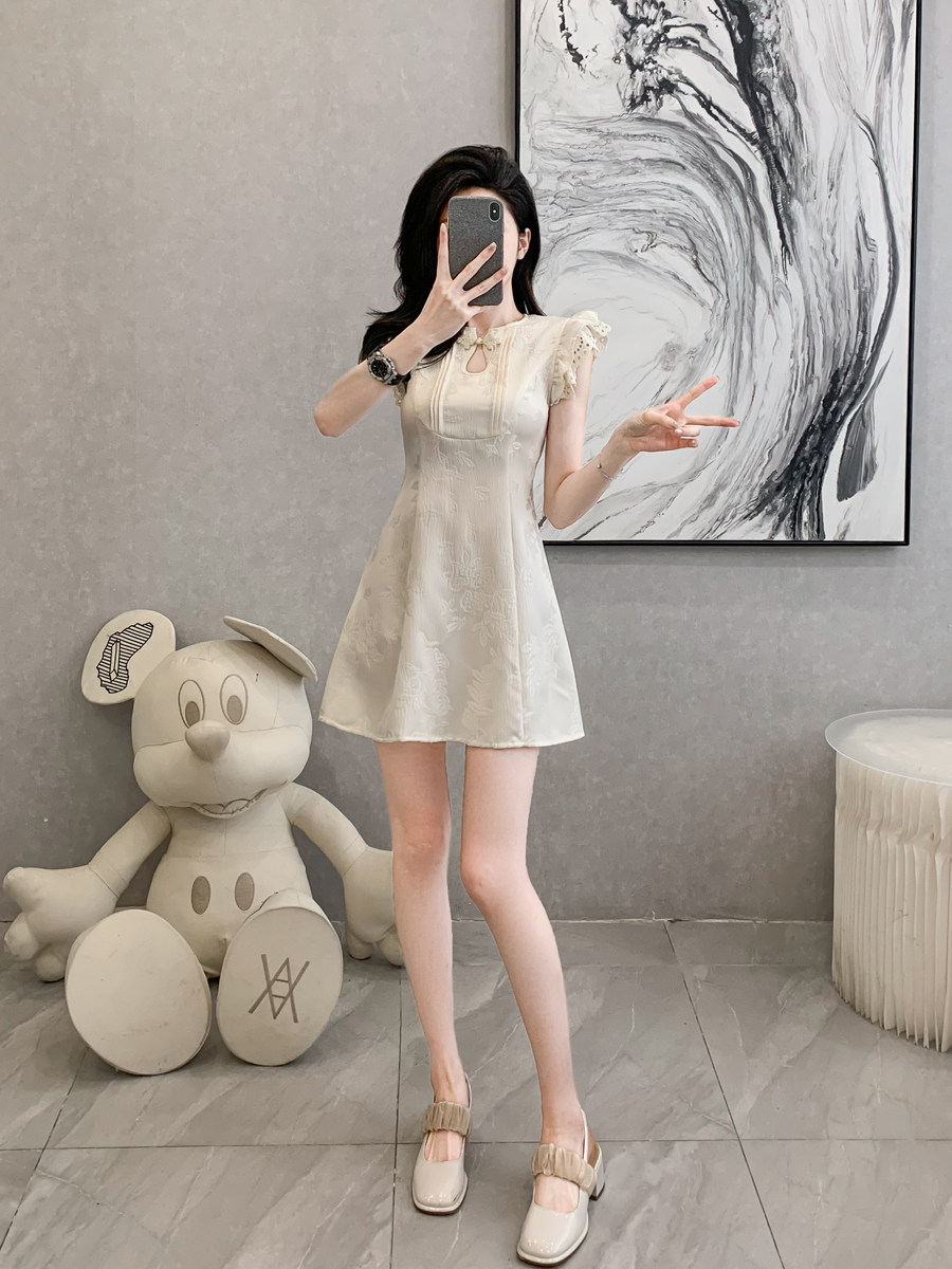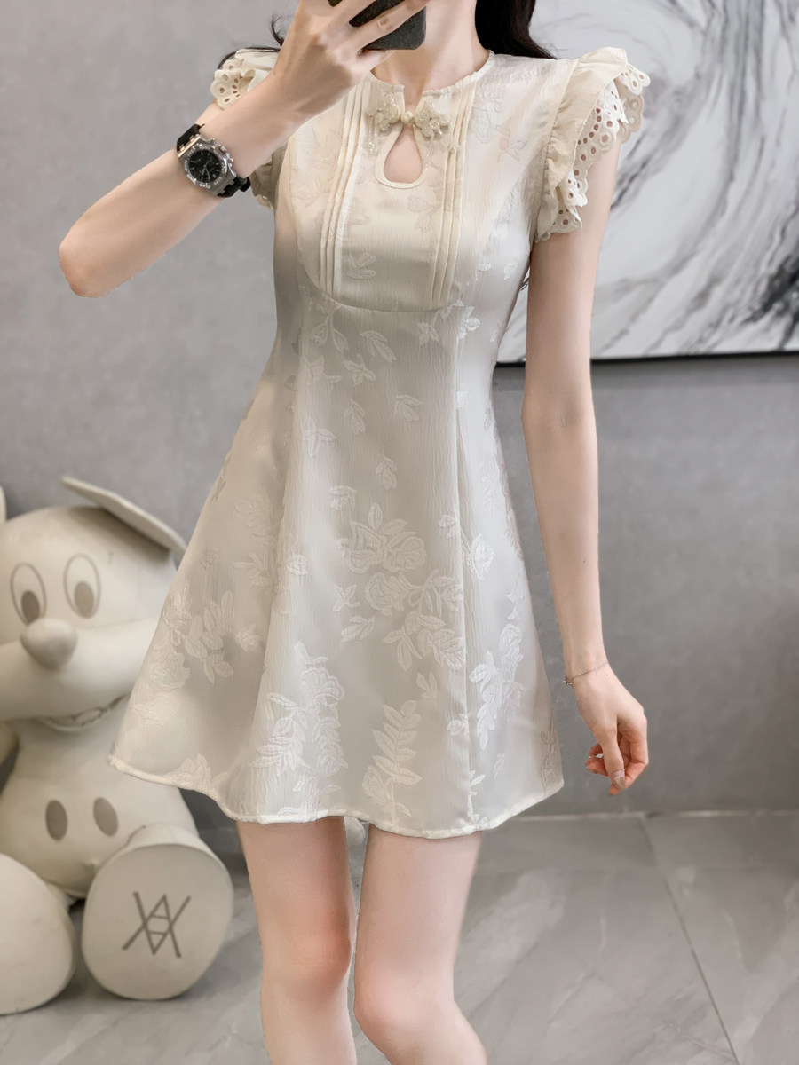 新中式国风飞飞袖提花连衣裙女夏季新款高级感收腰小个子短款裙子
