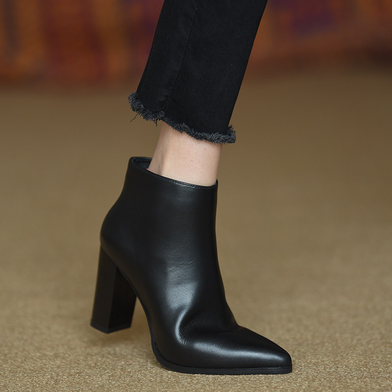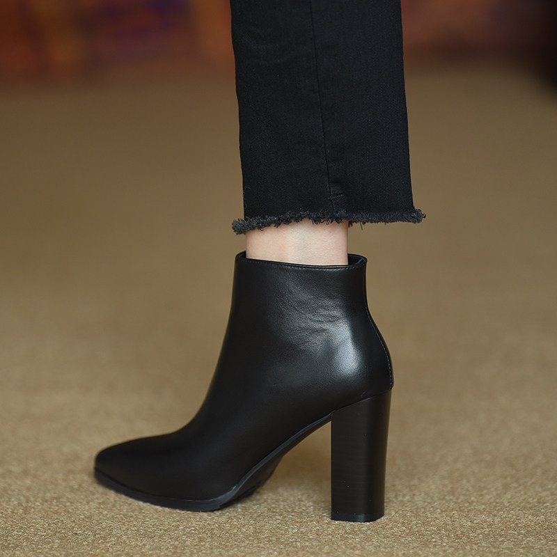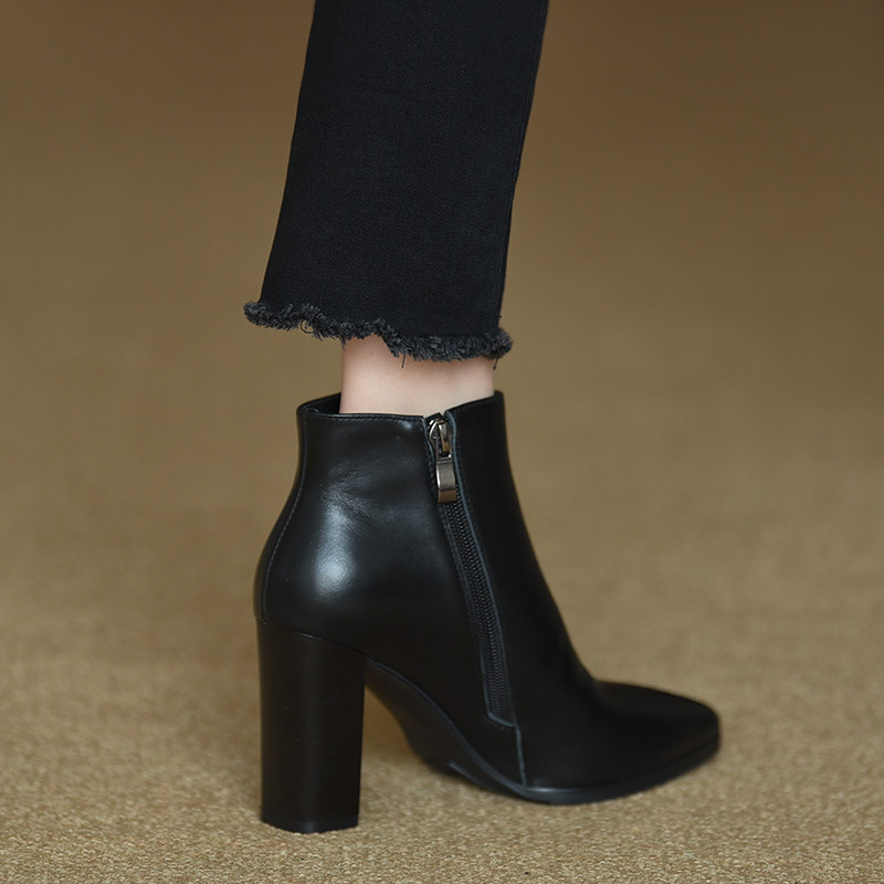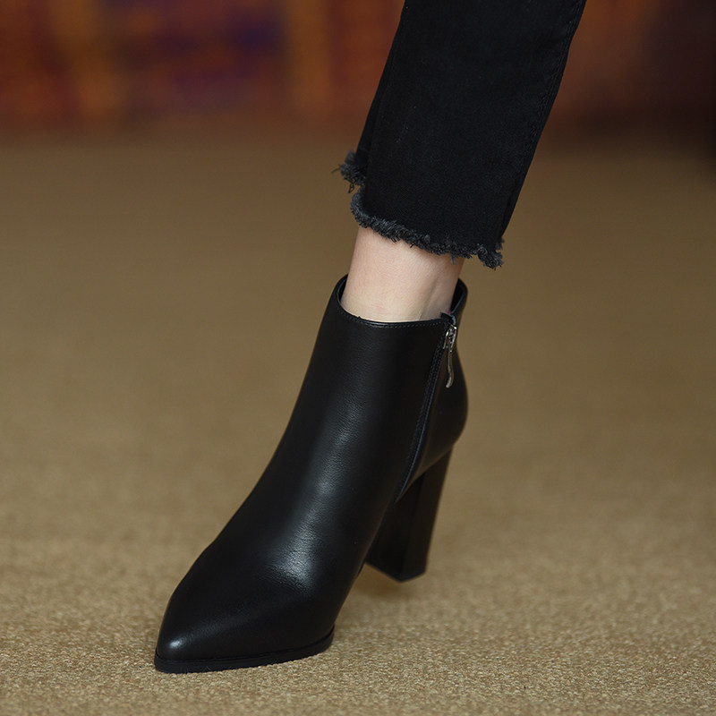 misili 真皮粗跟短靴女 2026年秋冬季新款高跟鞋侧拉链尖头及踝靴