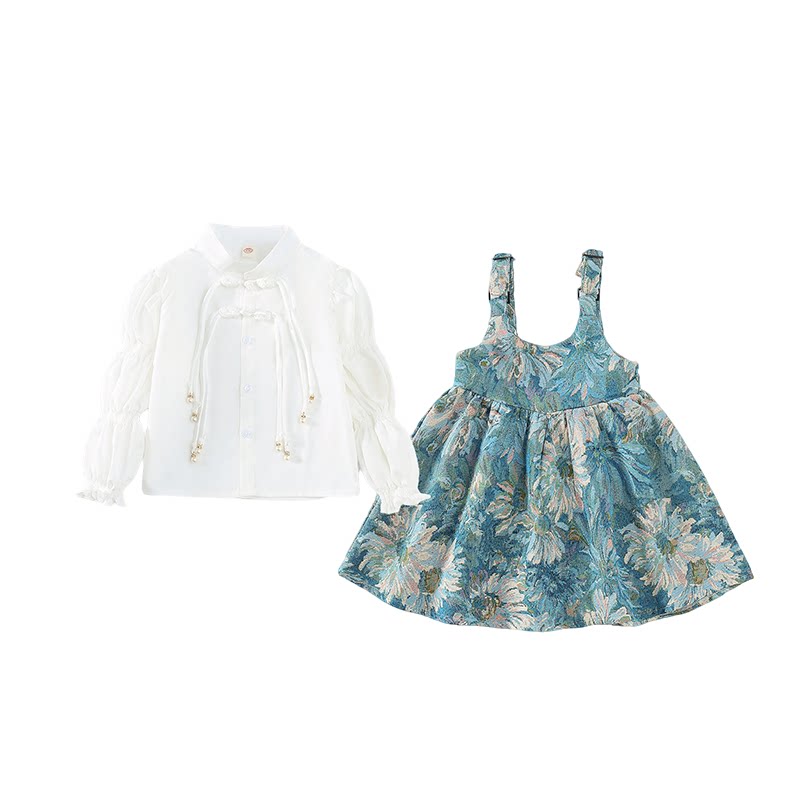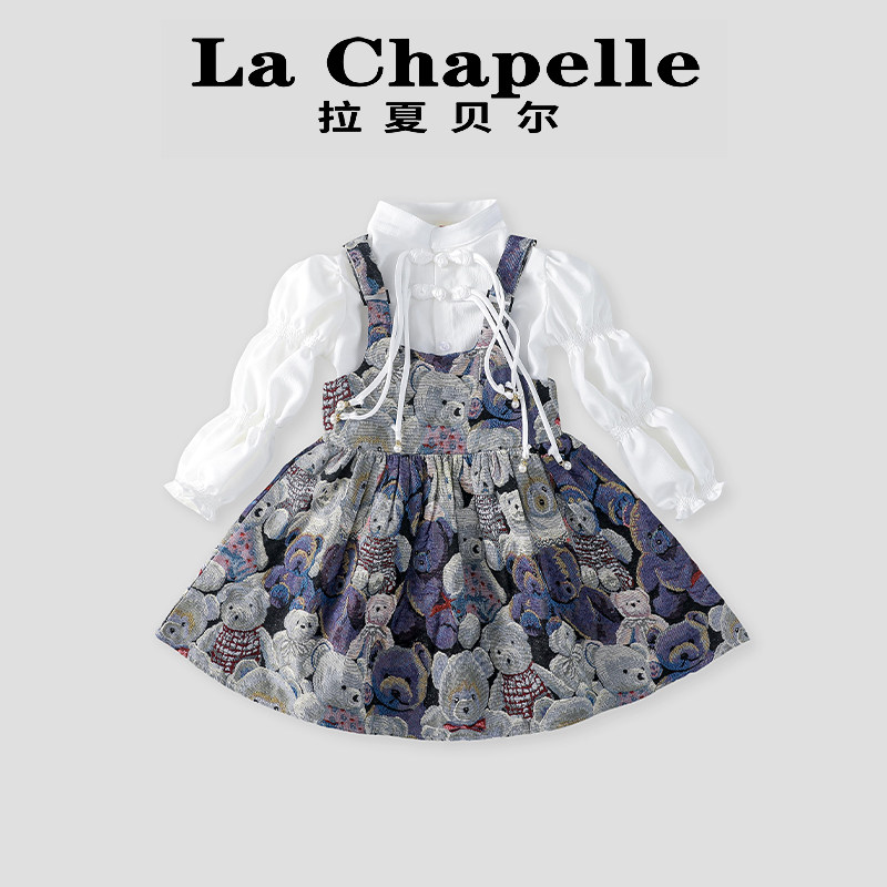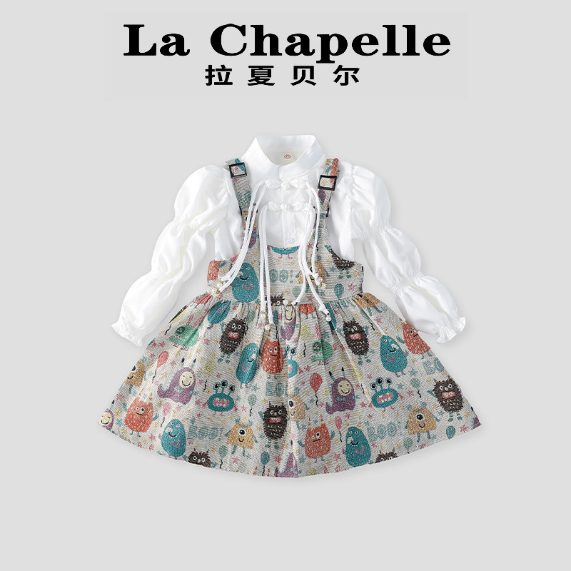 拉夏贝尔女童春装套装小童春秋裙子时髦碎花吊带儿童连衣裙两件套