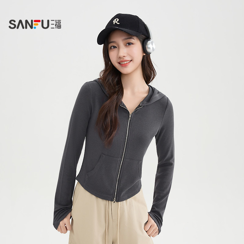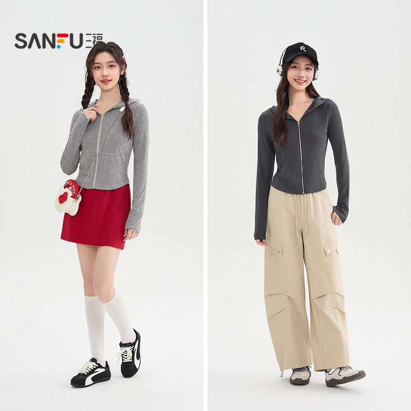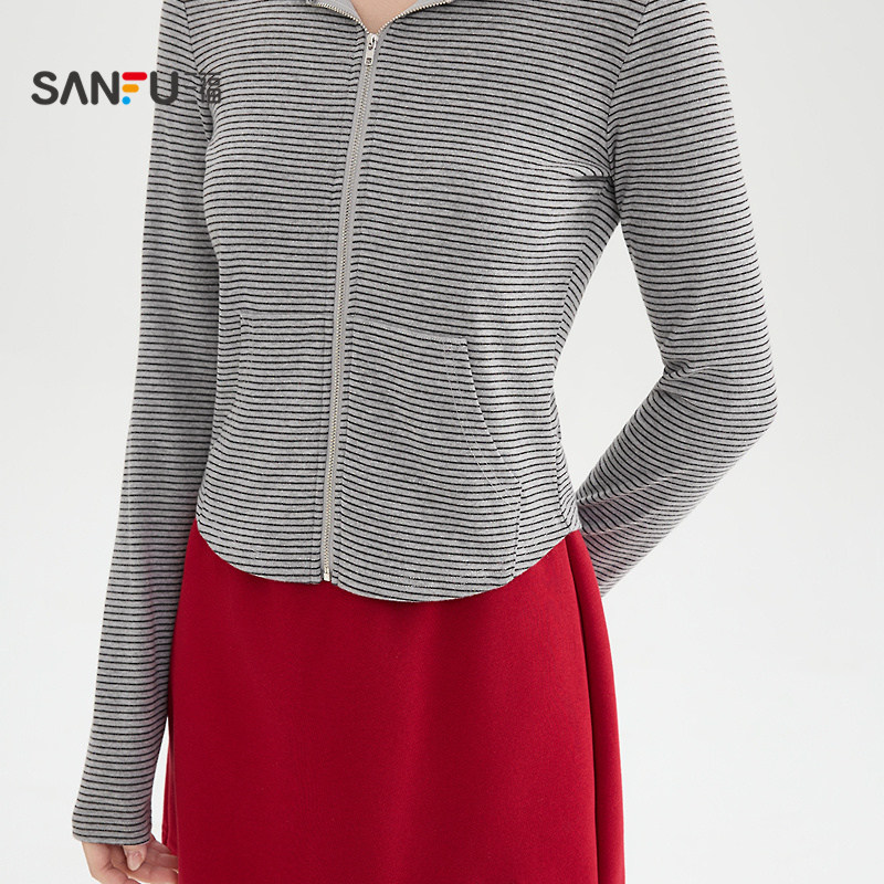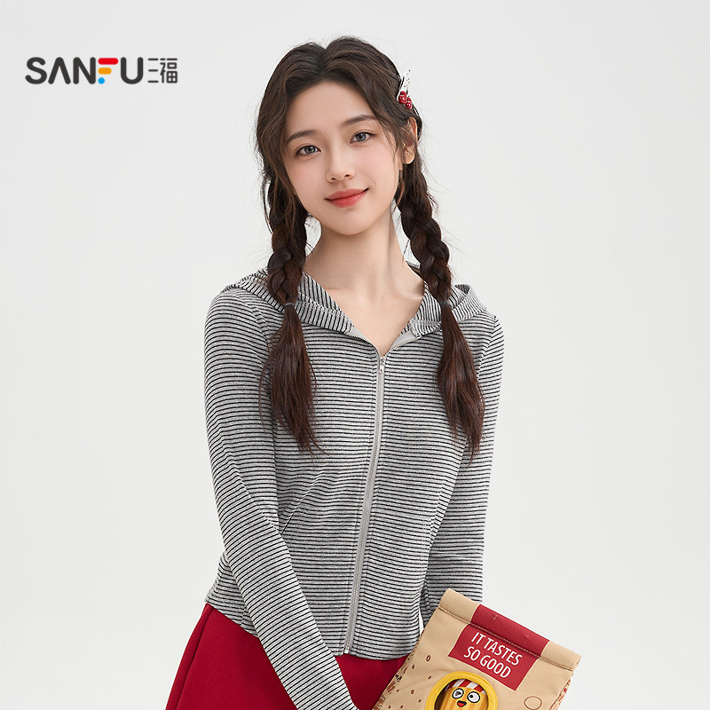 三福长袖上衣女2026新款春季显瘦条纹连帽短款开衫t恤女装515852