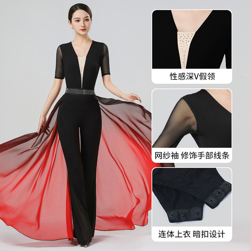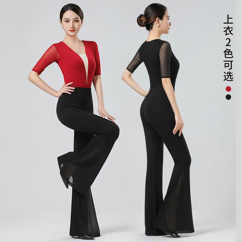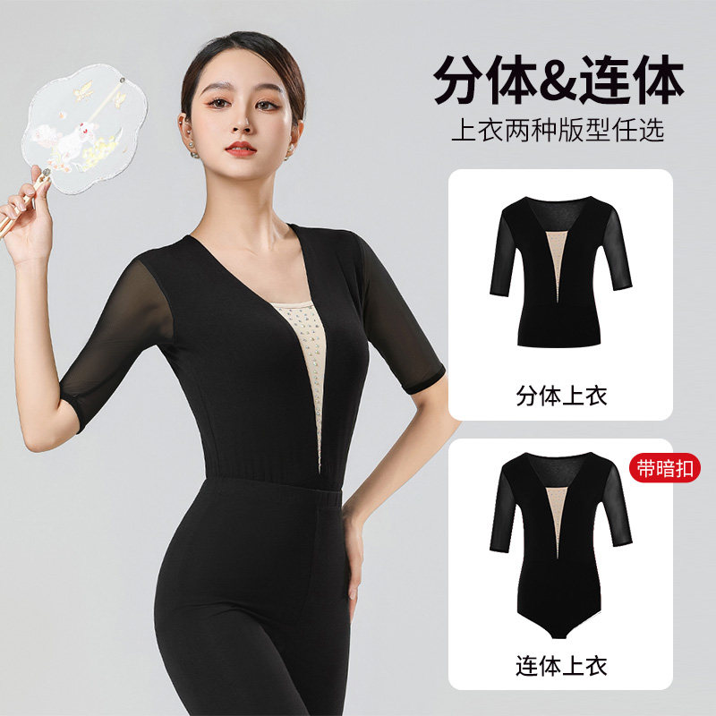 形体服套装女2025新款成人网纱彩钻拼接中袖莫代尔舞蹈上衣长裤夏