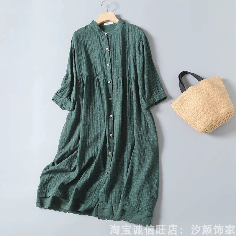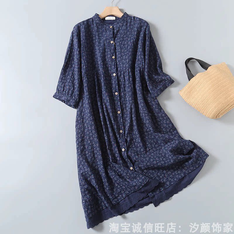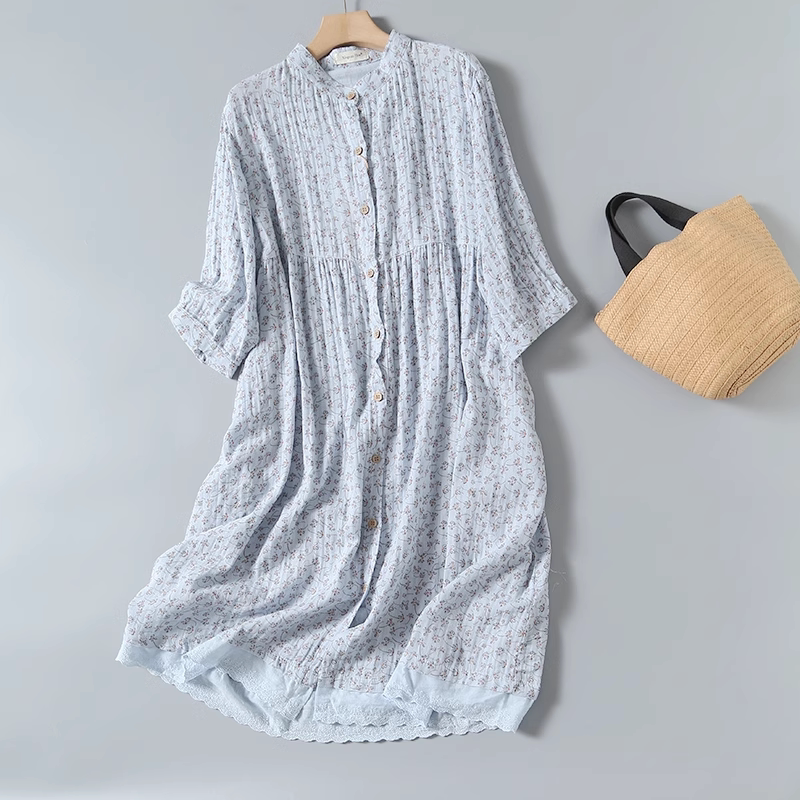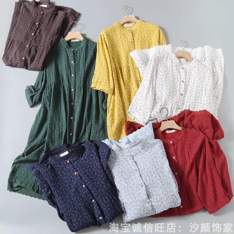 文艺小清新碎花立领木扣宽松双层棉纱白衬衫女长款连衣裙大码J07