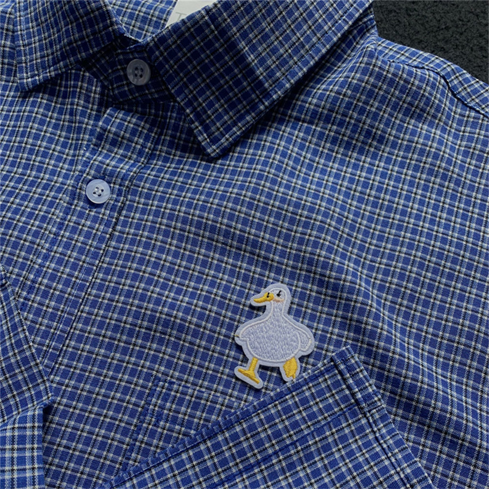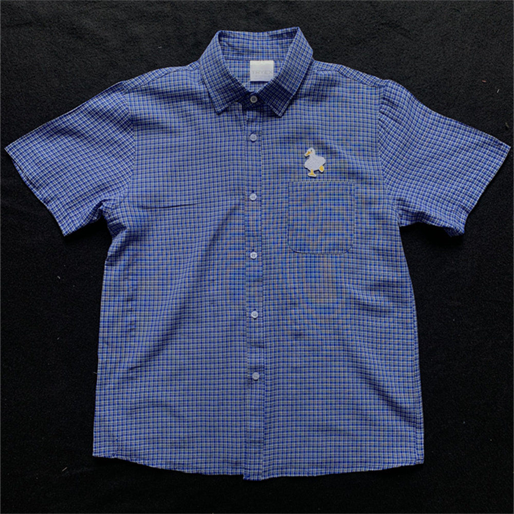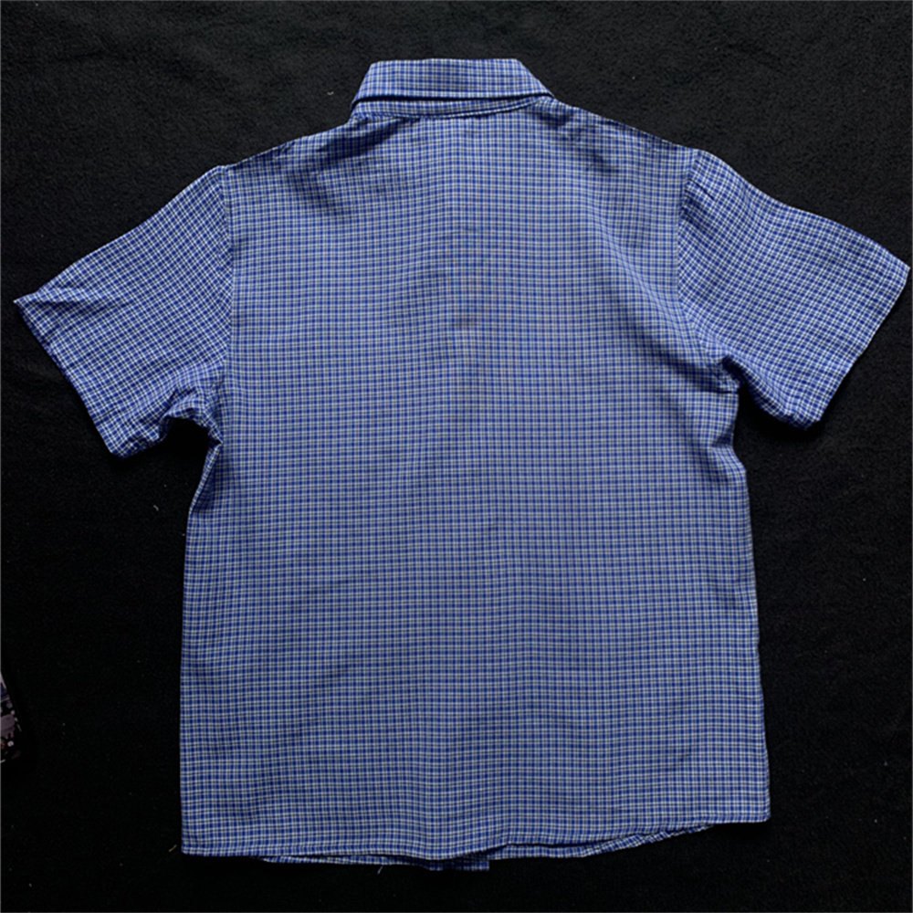 夏季薄款日系格子衬衫男款潮牌宽松短袖蓝色细格纹衬衣男半袖上衣
