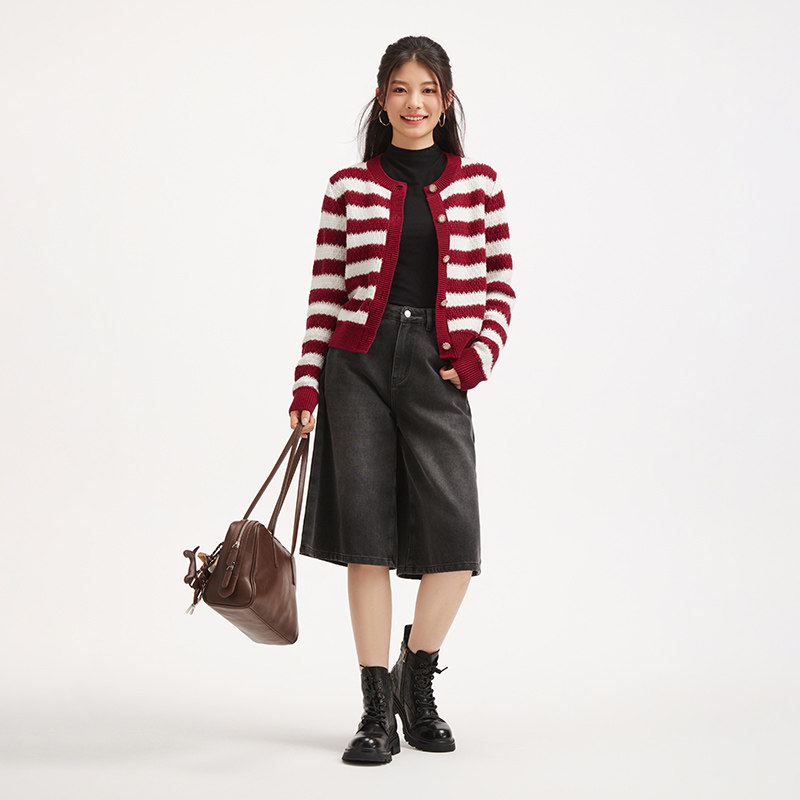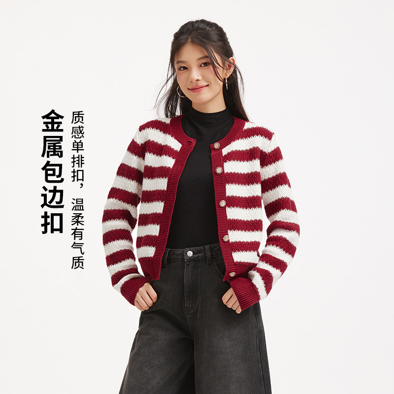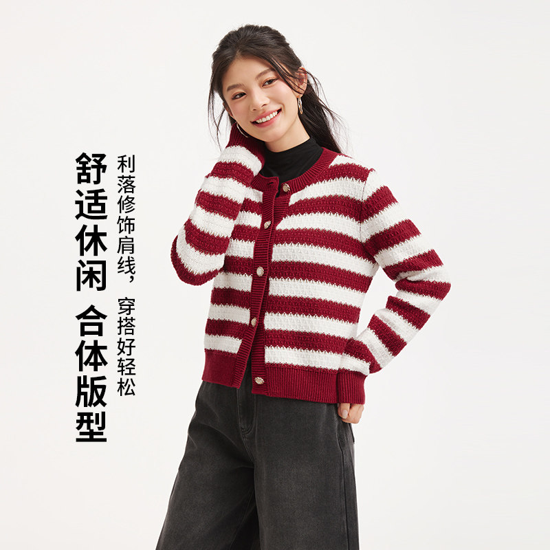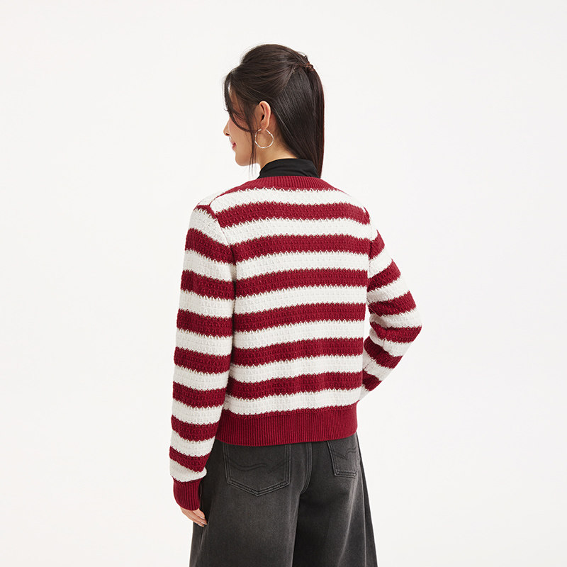 热风女士红色针织衫2026年春季新款红色条纹新年针织衫内搭上衣