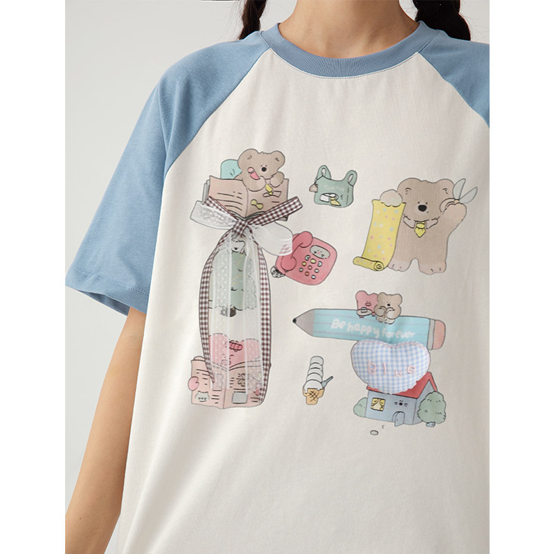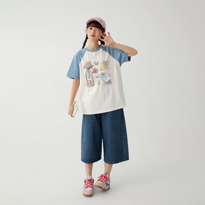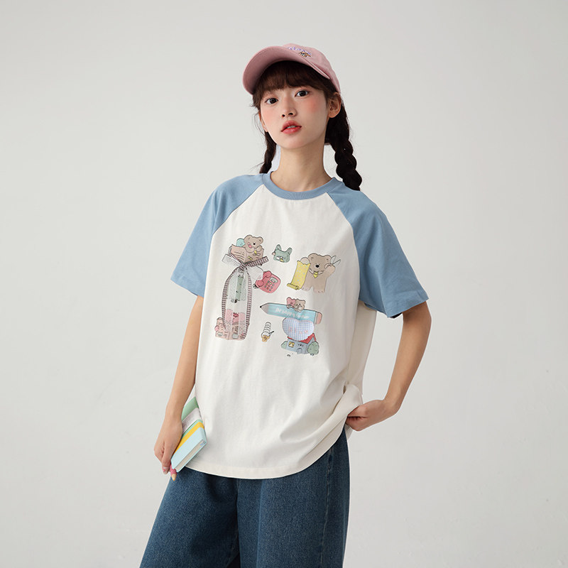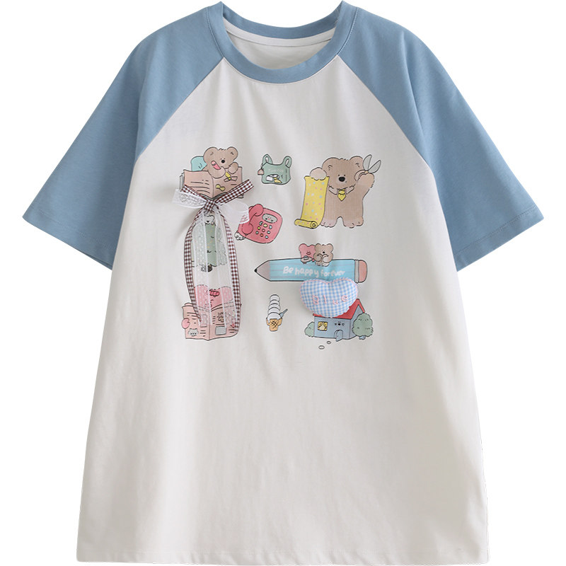 诺诺公主S1N初中生夏趣味卡通圆领插肩袖t恤潮透气宽松运动短袖女