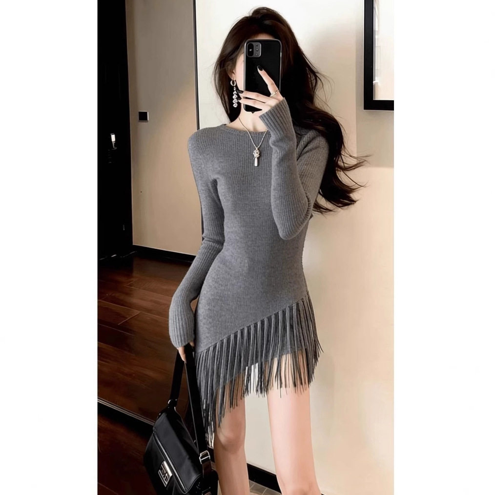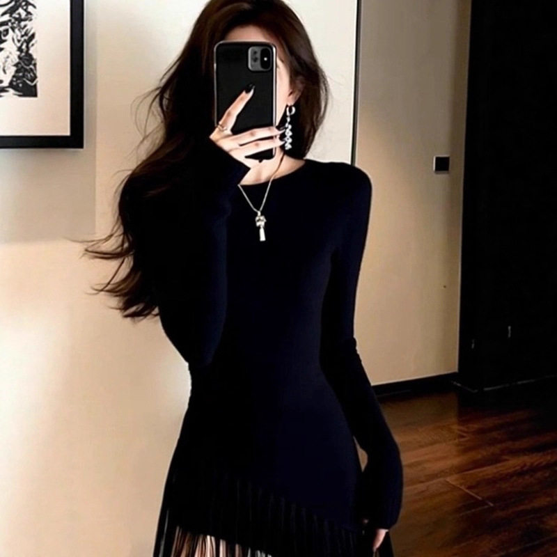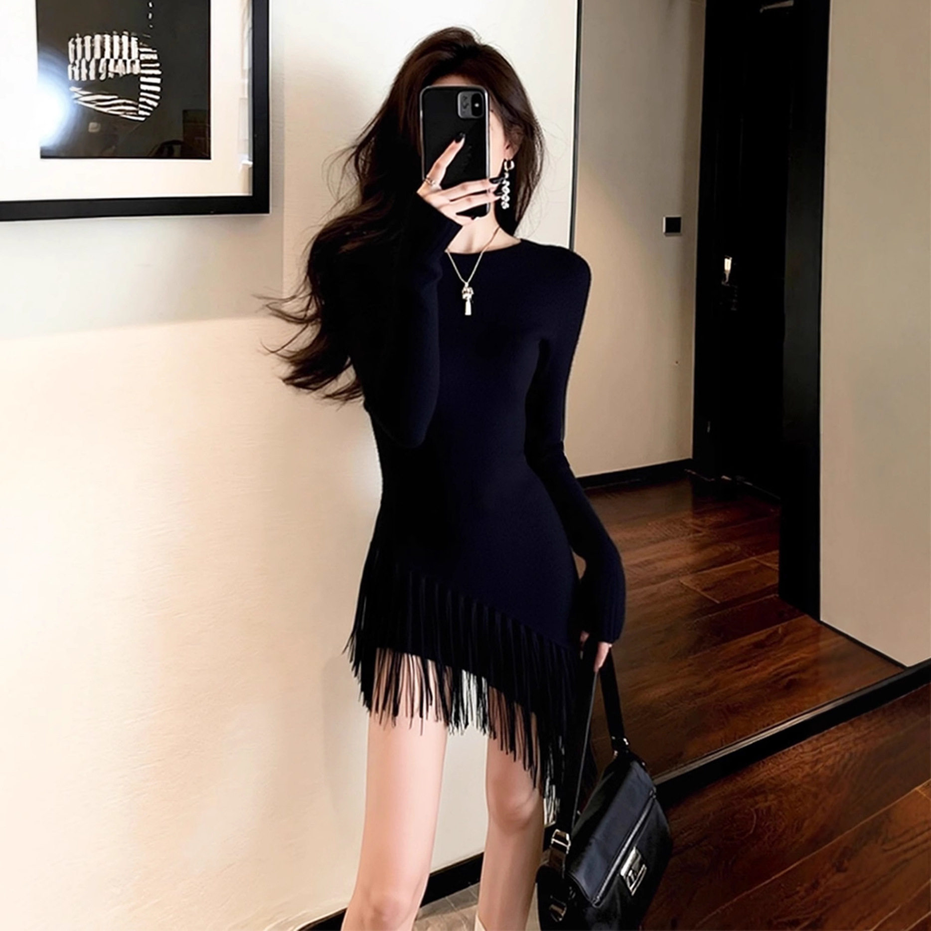 黑色长袖流苏连衣裙2026春季新款富家千金短款收腰包臀裙裙子女装