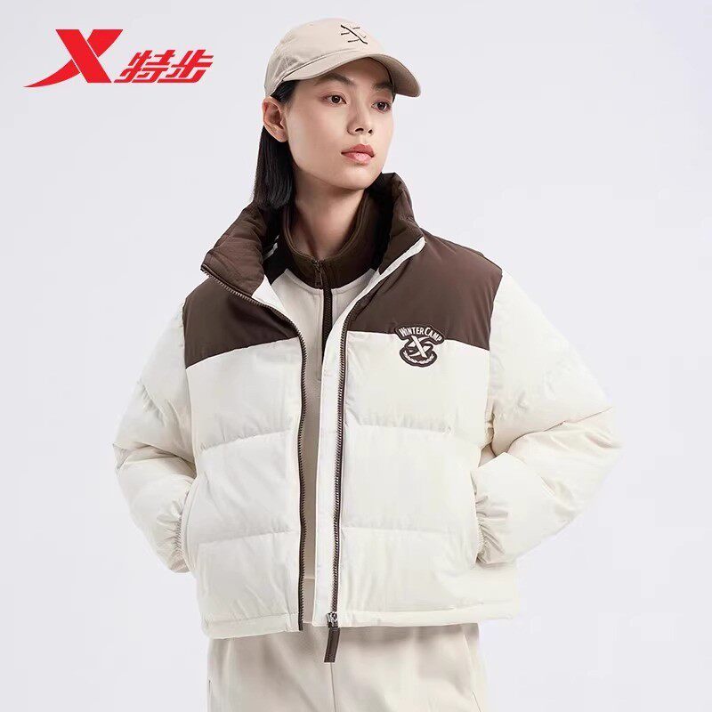 特步短款羽绒服女2024冬季新款潮流加绒加厚保暖立领运动外套棉服