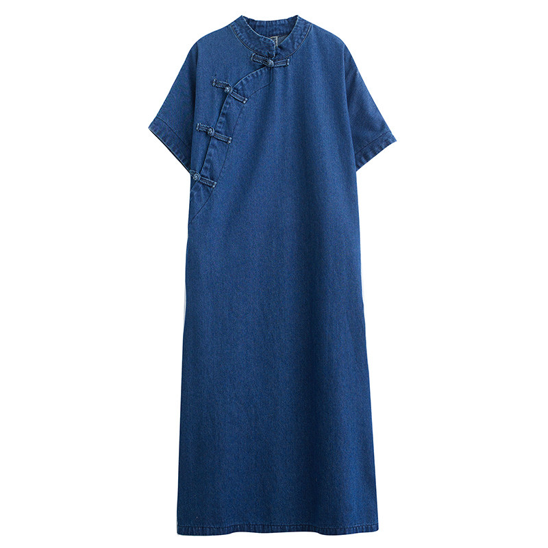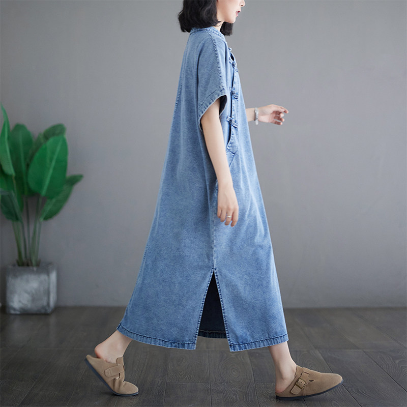 新中式国风盘扣牛仔连衣裙女大码胖mm宽松遮肉改良旗袍开叉a字裙
