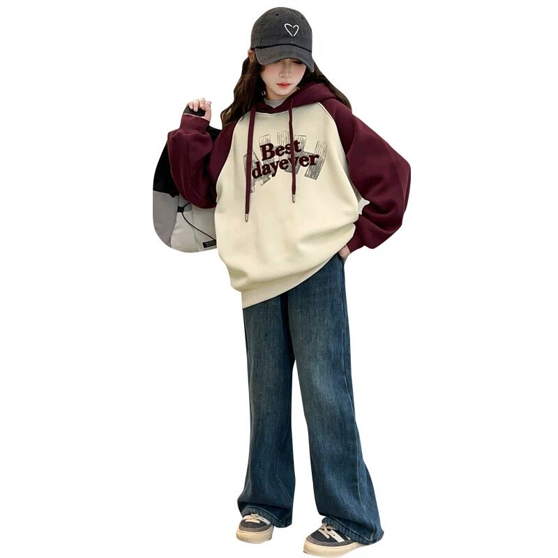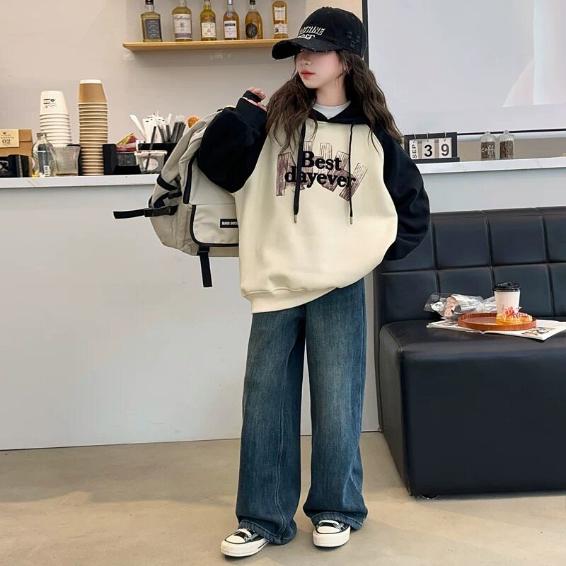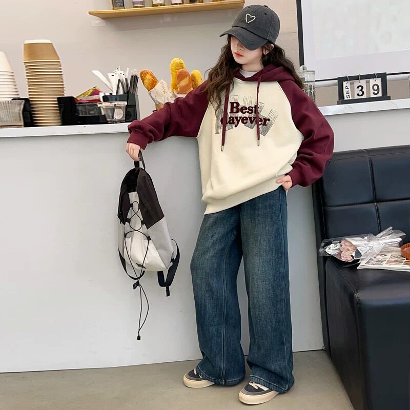 儿童女童撞色插肩连帽卫衣春秋冬新款中大童加绒加厚保暖上衣外套