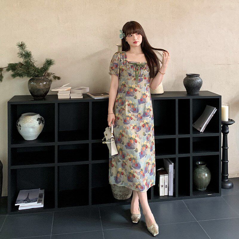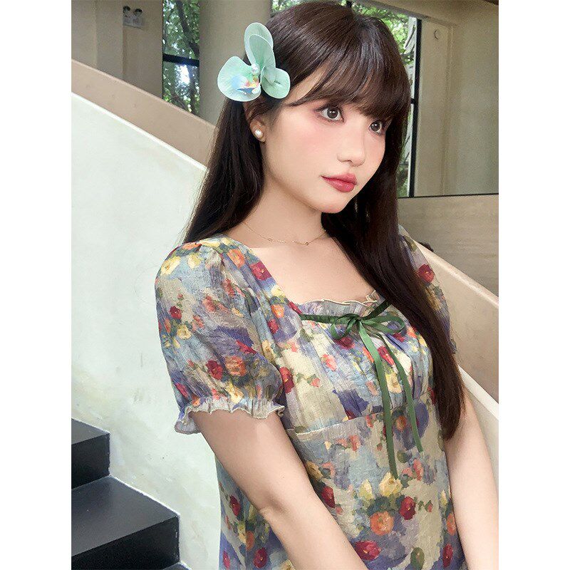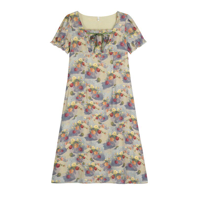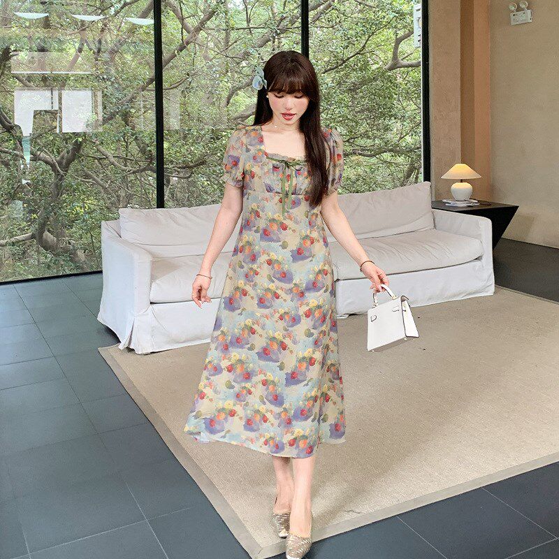 法式复古油画碎花连衣裙夏季大码胖mm收腰显瘦海边度假长裙甜美潮