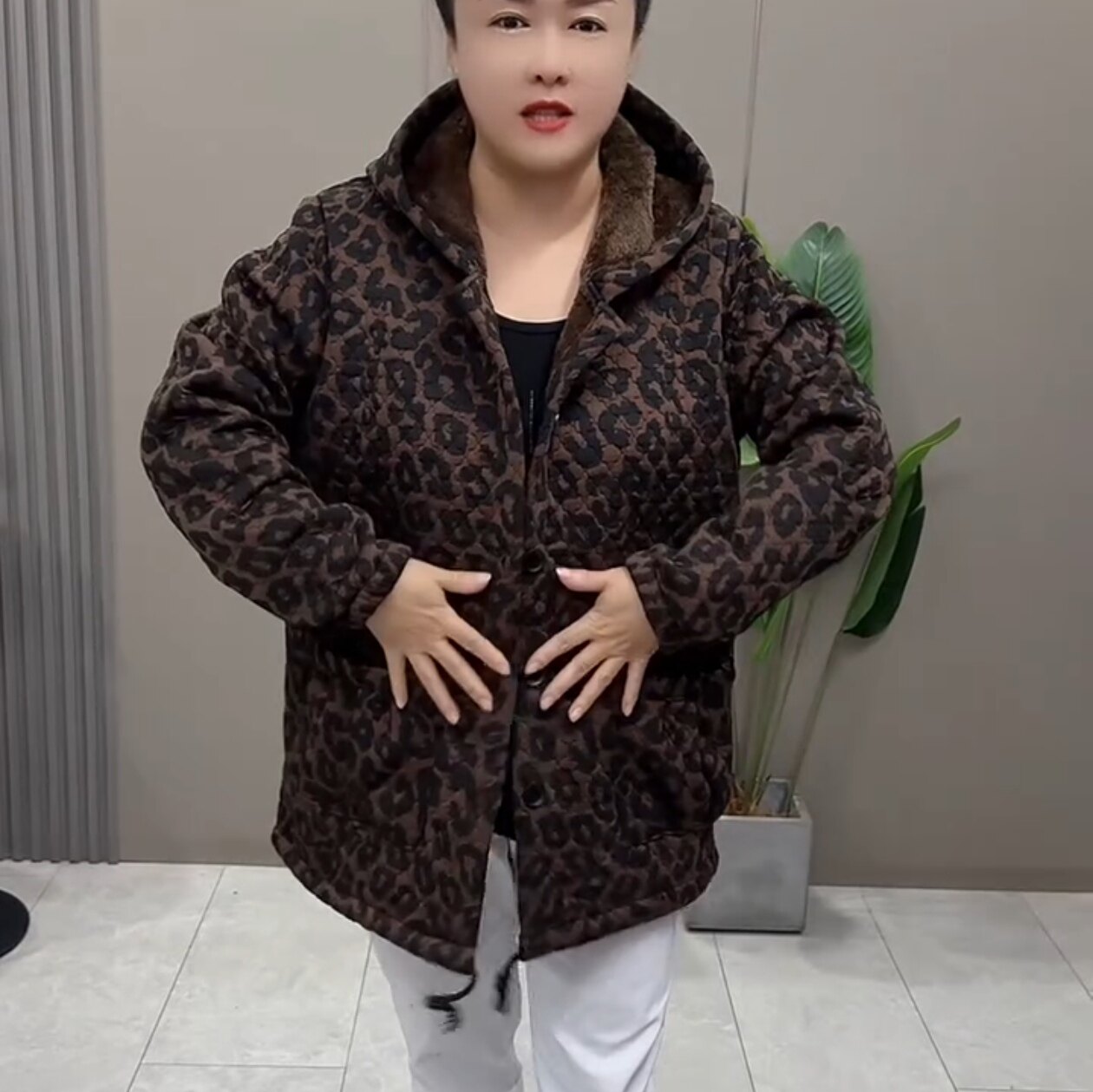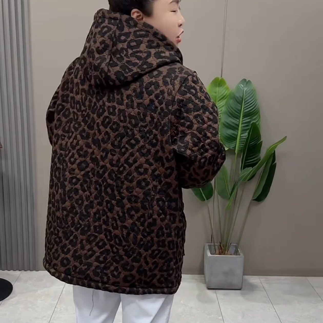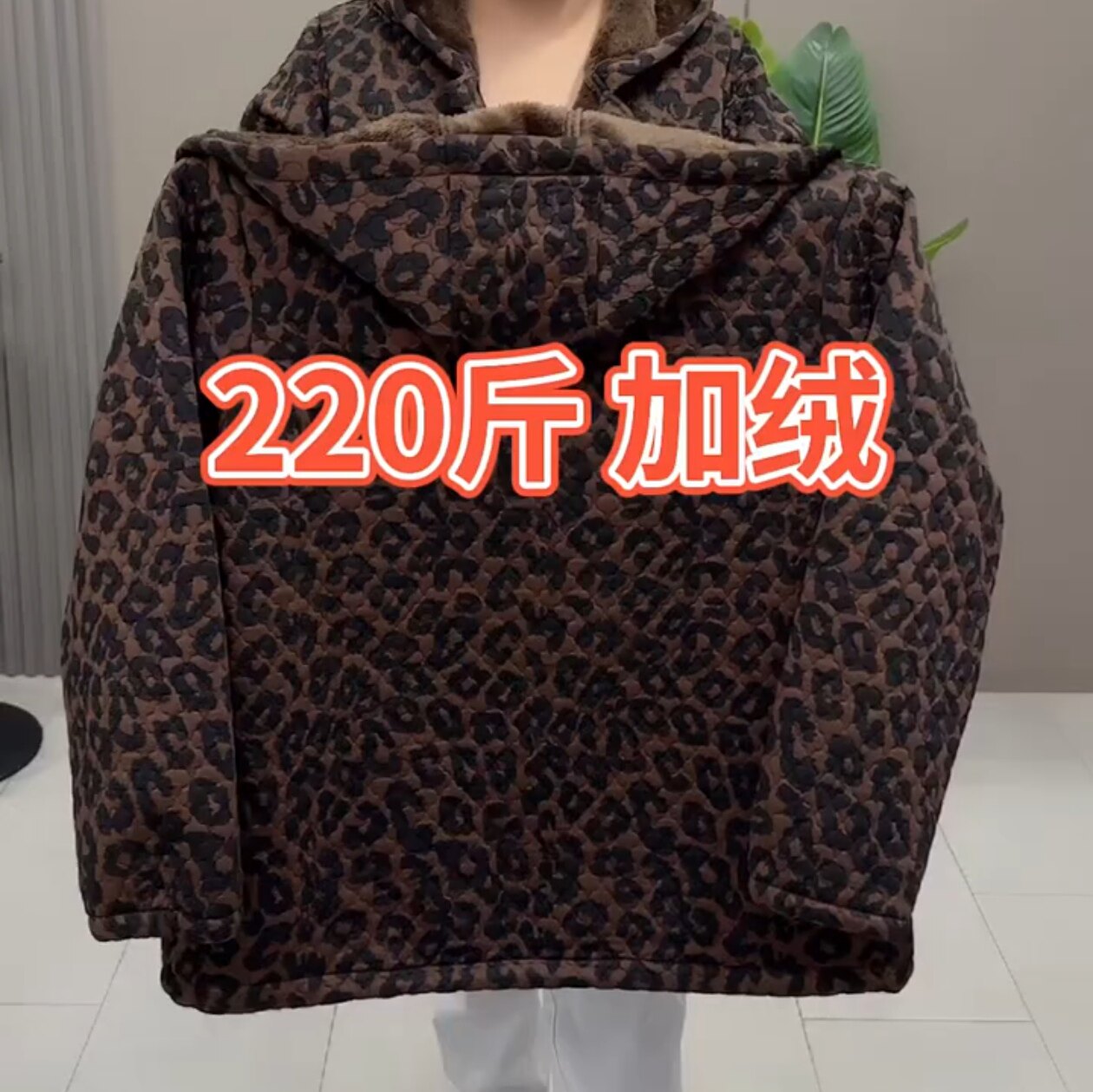 冬季时尚洋气女加肥加大码连帽豹纹加绒棉服外套加厚保暖棉衣显瘦