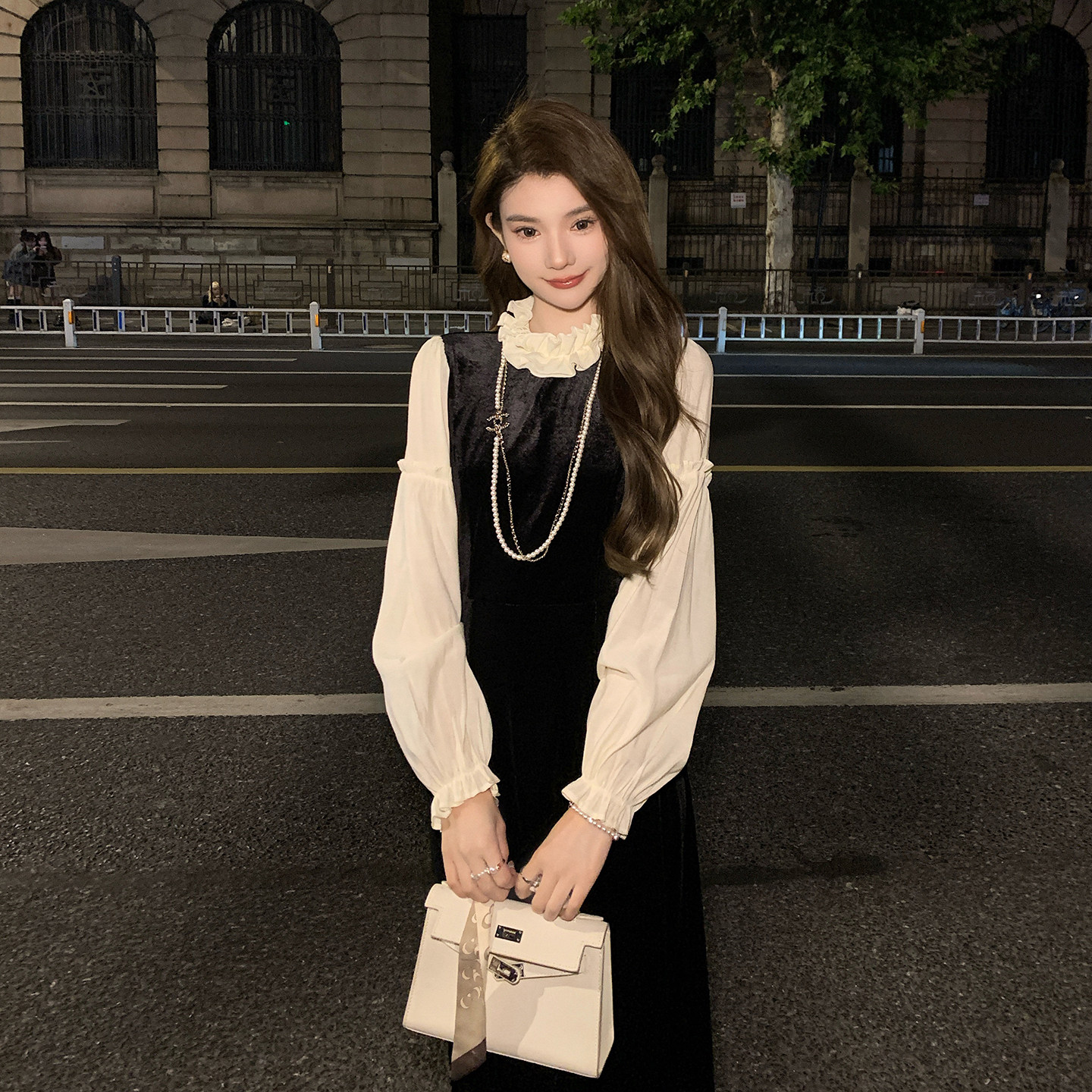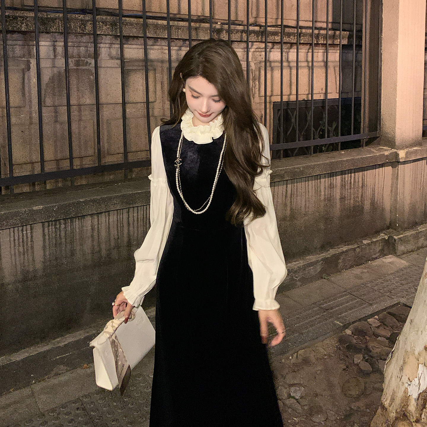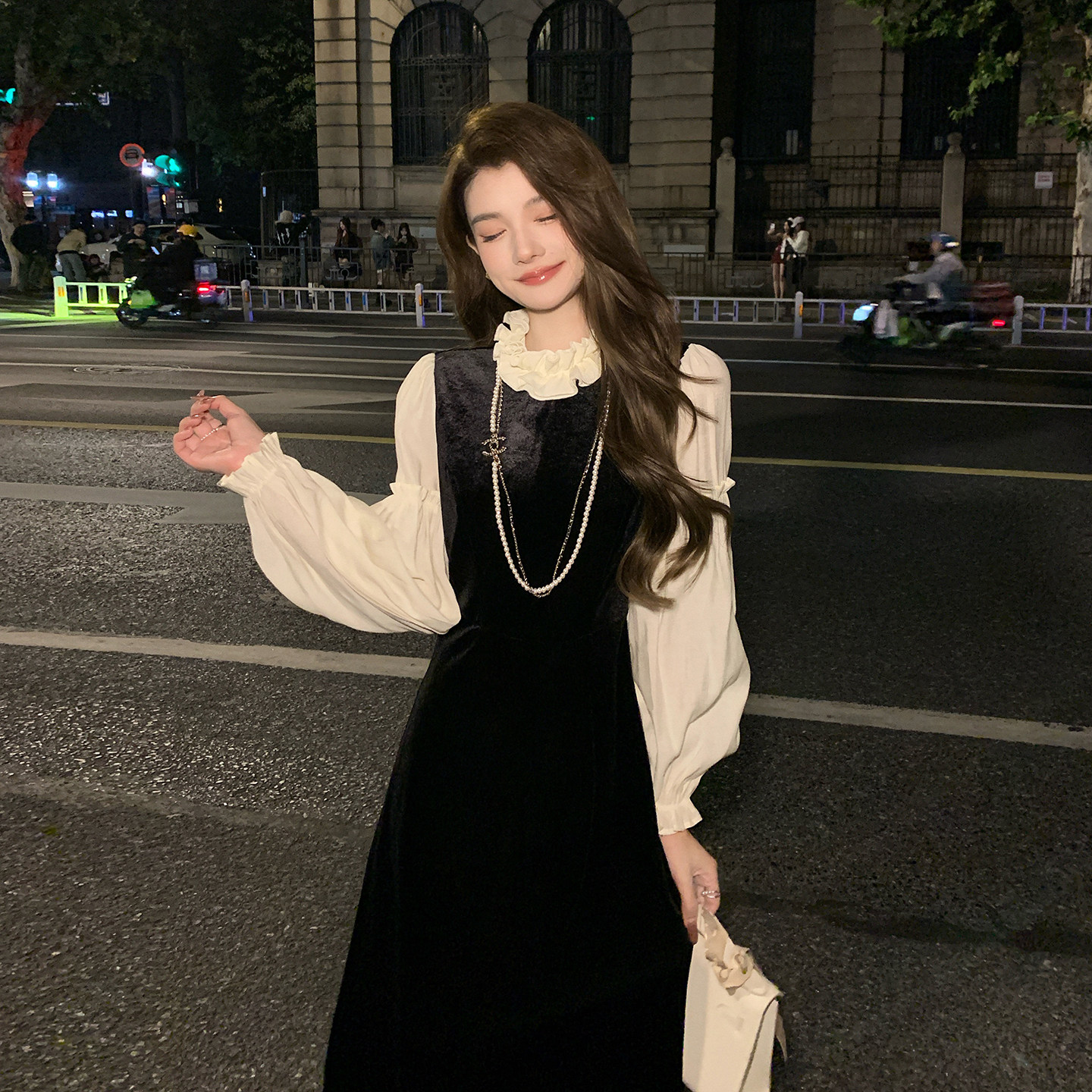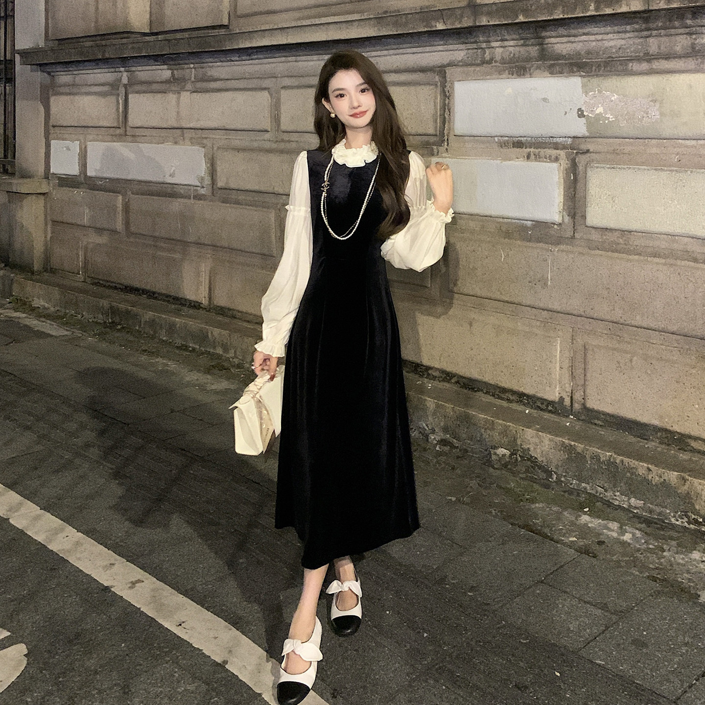 AMNANA法式黑色赫本丝绒连衣裙女长袖轻奢小黑裙修身显瘦长裙子