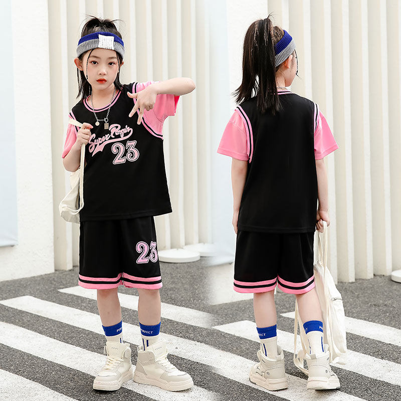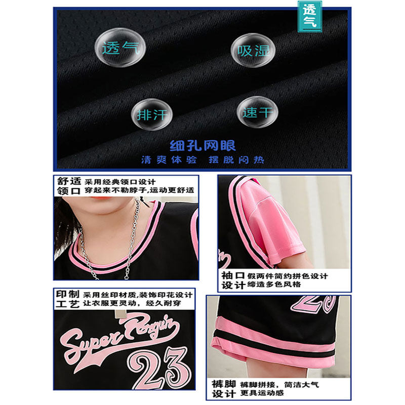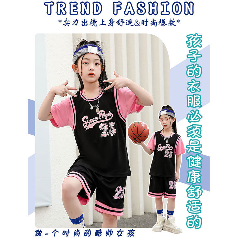 女孩篮球服套装女童夏款休闲运动服速干学生假两件短袖儿童训练服
