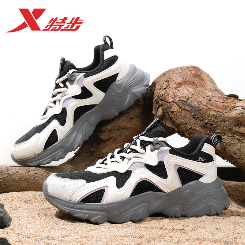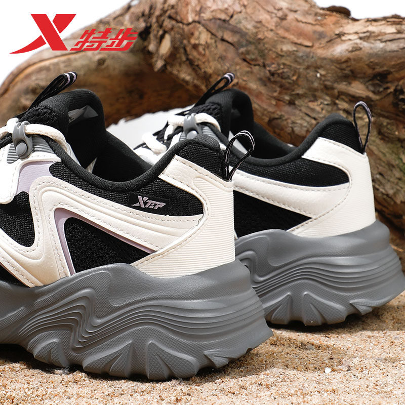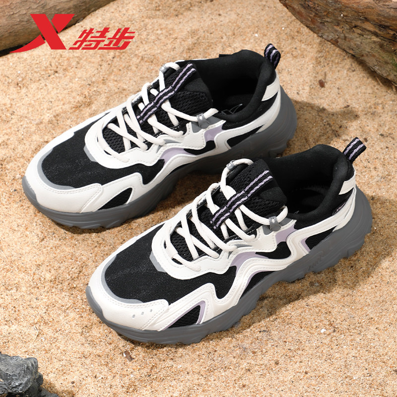 特步女鞋夏季新款透气黑色运动鞋女款正品厚底老爹鞋网面休闲鞋子