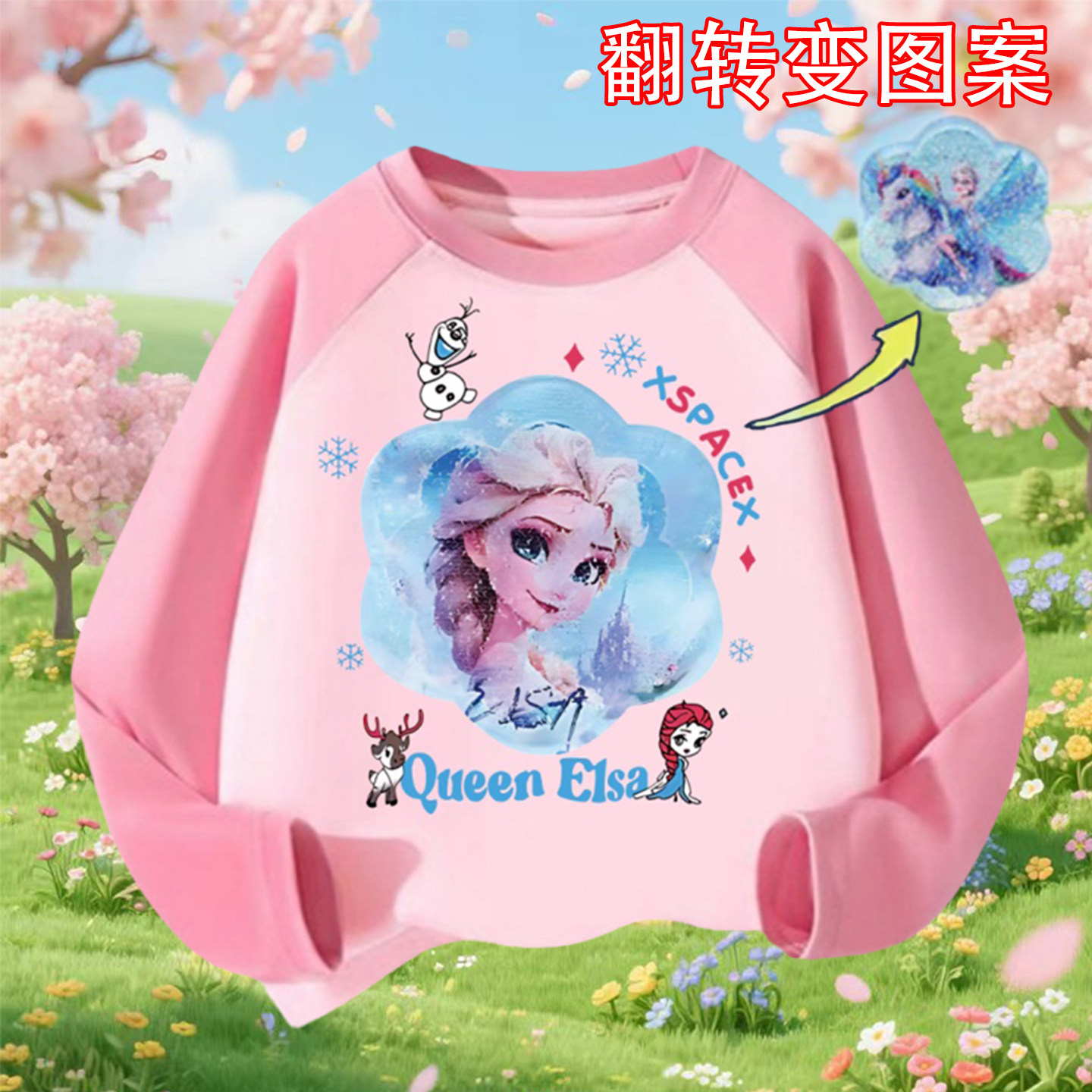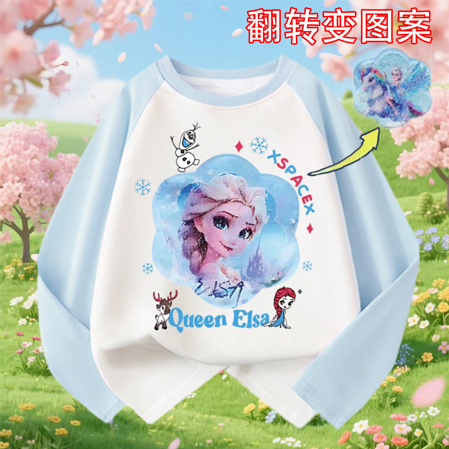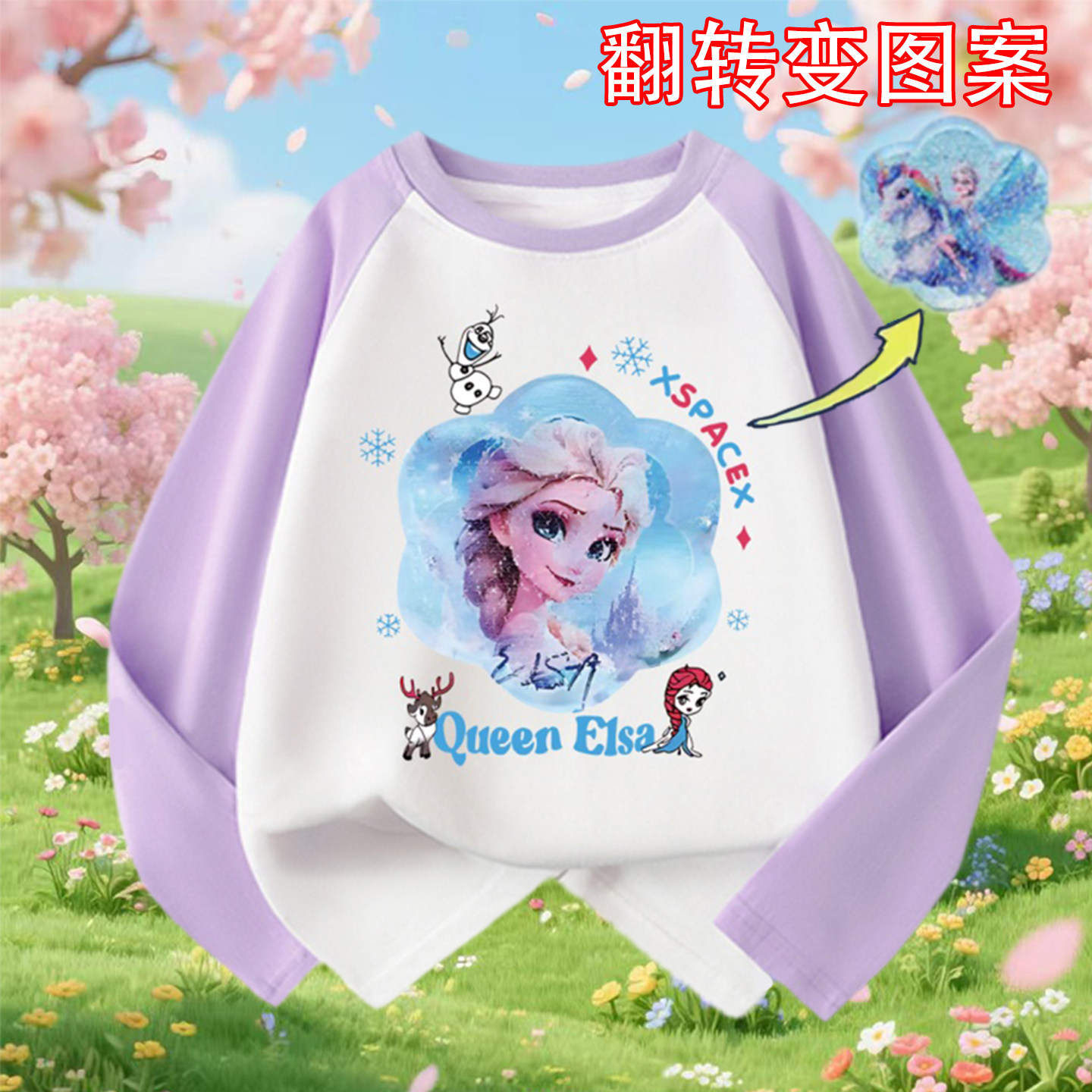 春季新款女童爱莎公主长袖t恤打底衫中大童纯棉翻转图案变色上衣