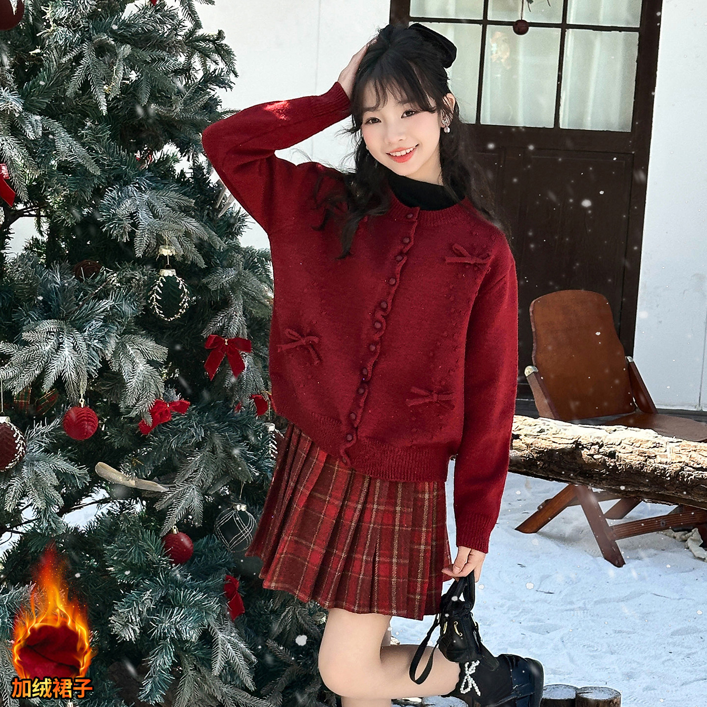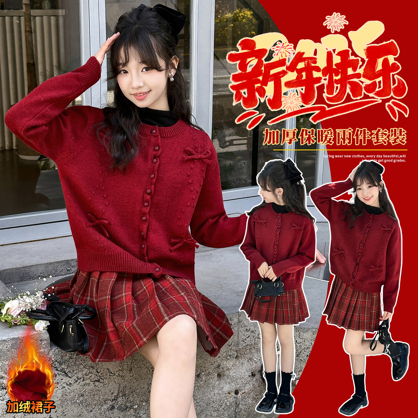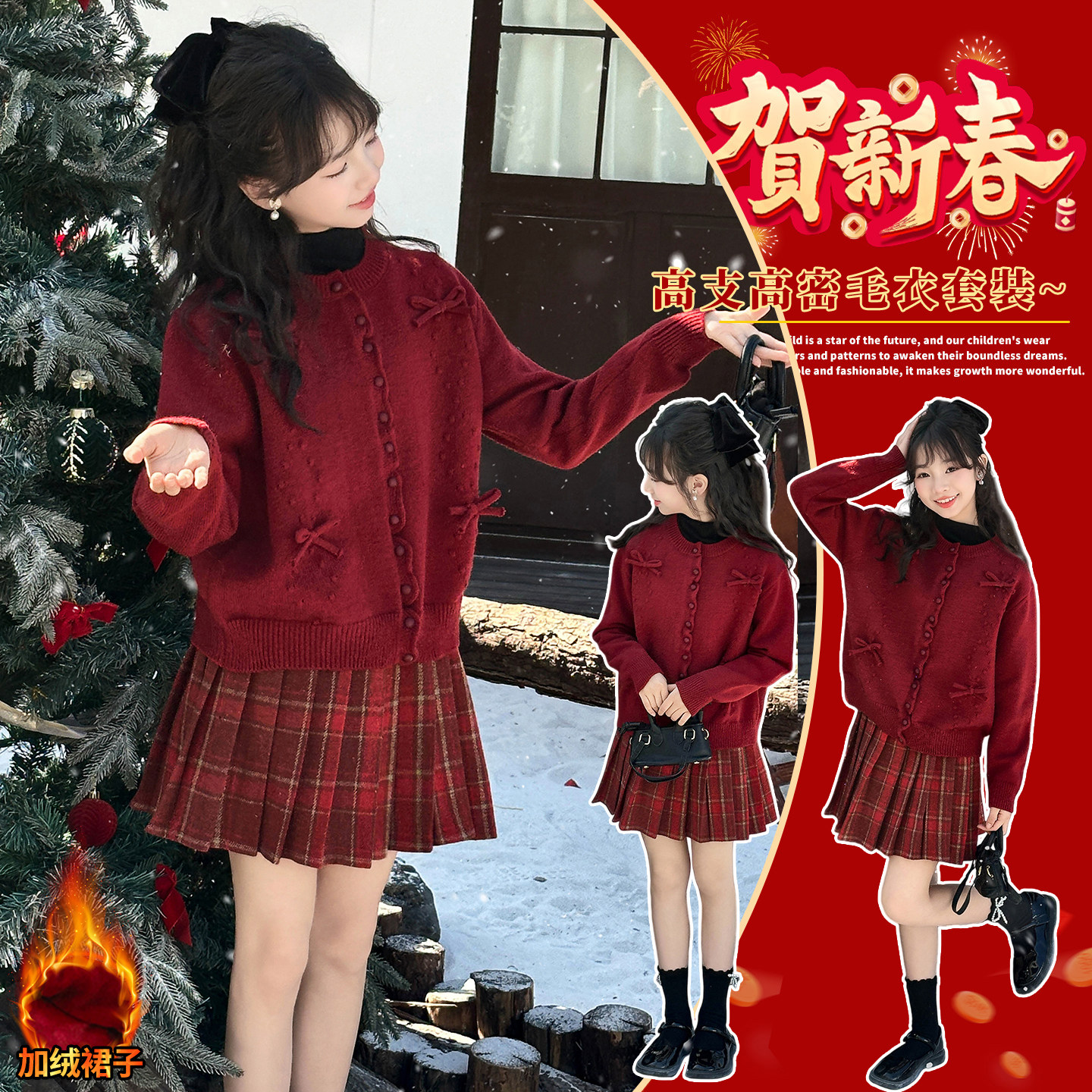 女童复古红色毛衣开衫2026新款儿童好看红色毛衣半身裙休闲两件套