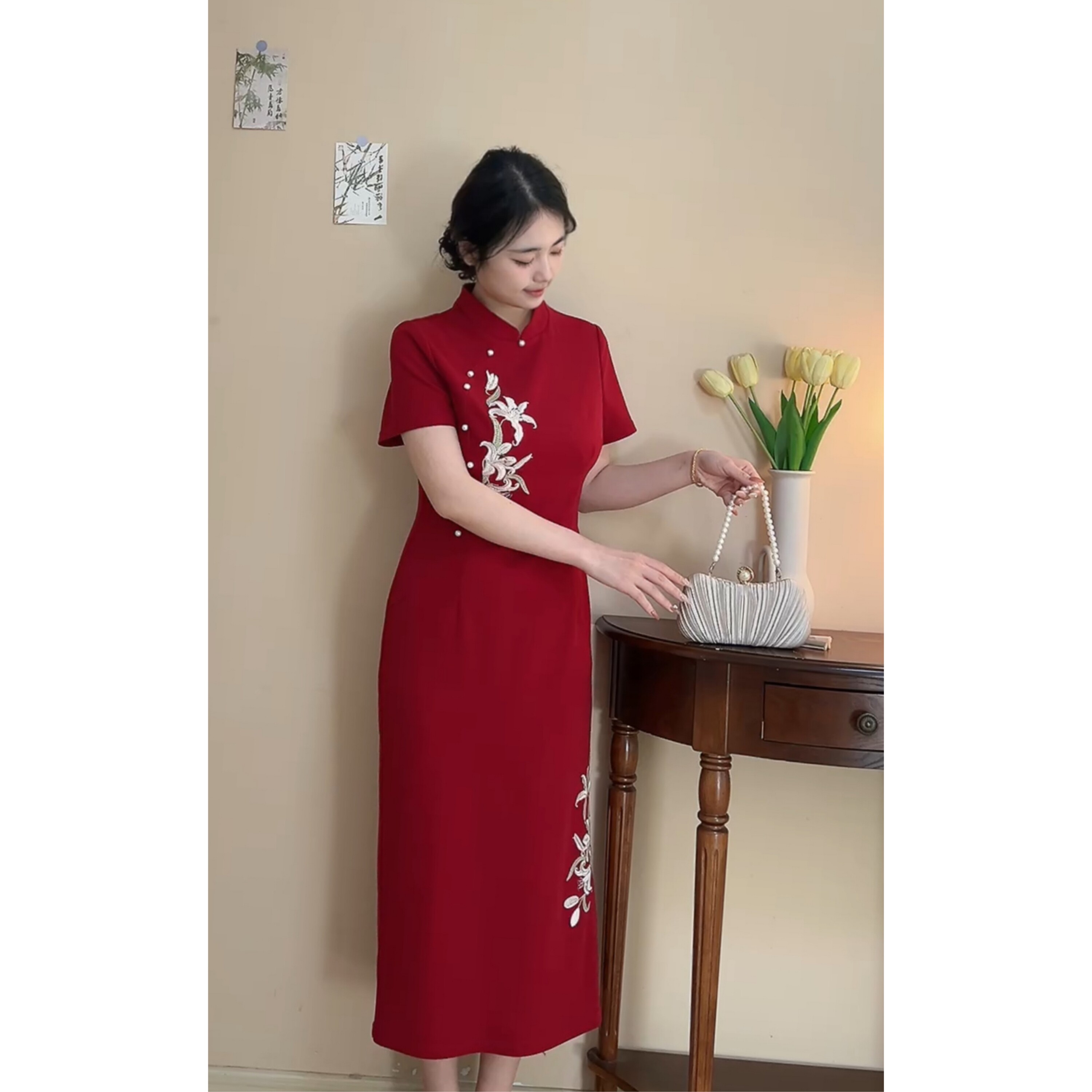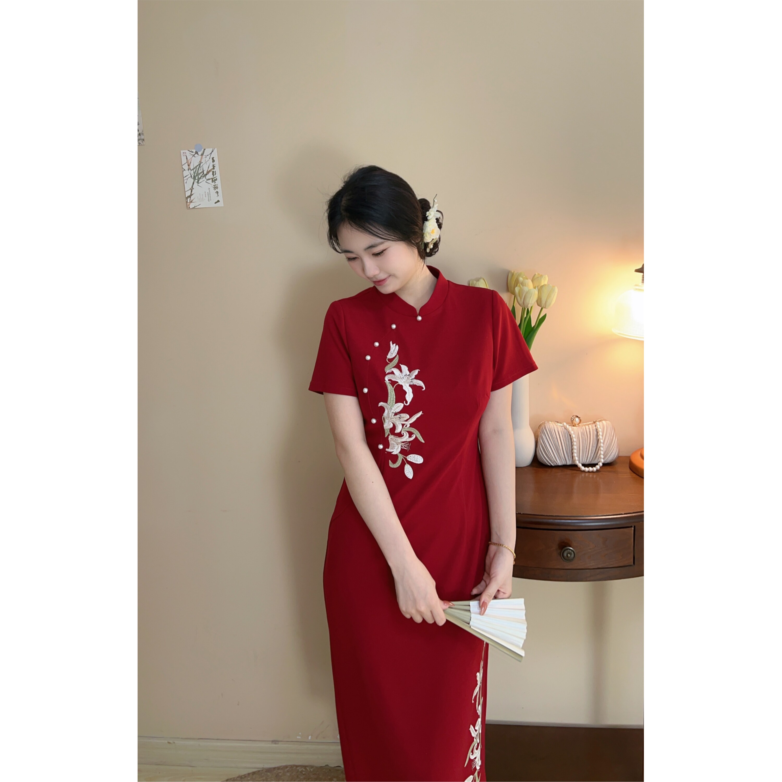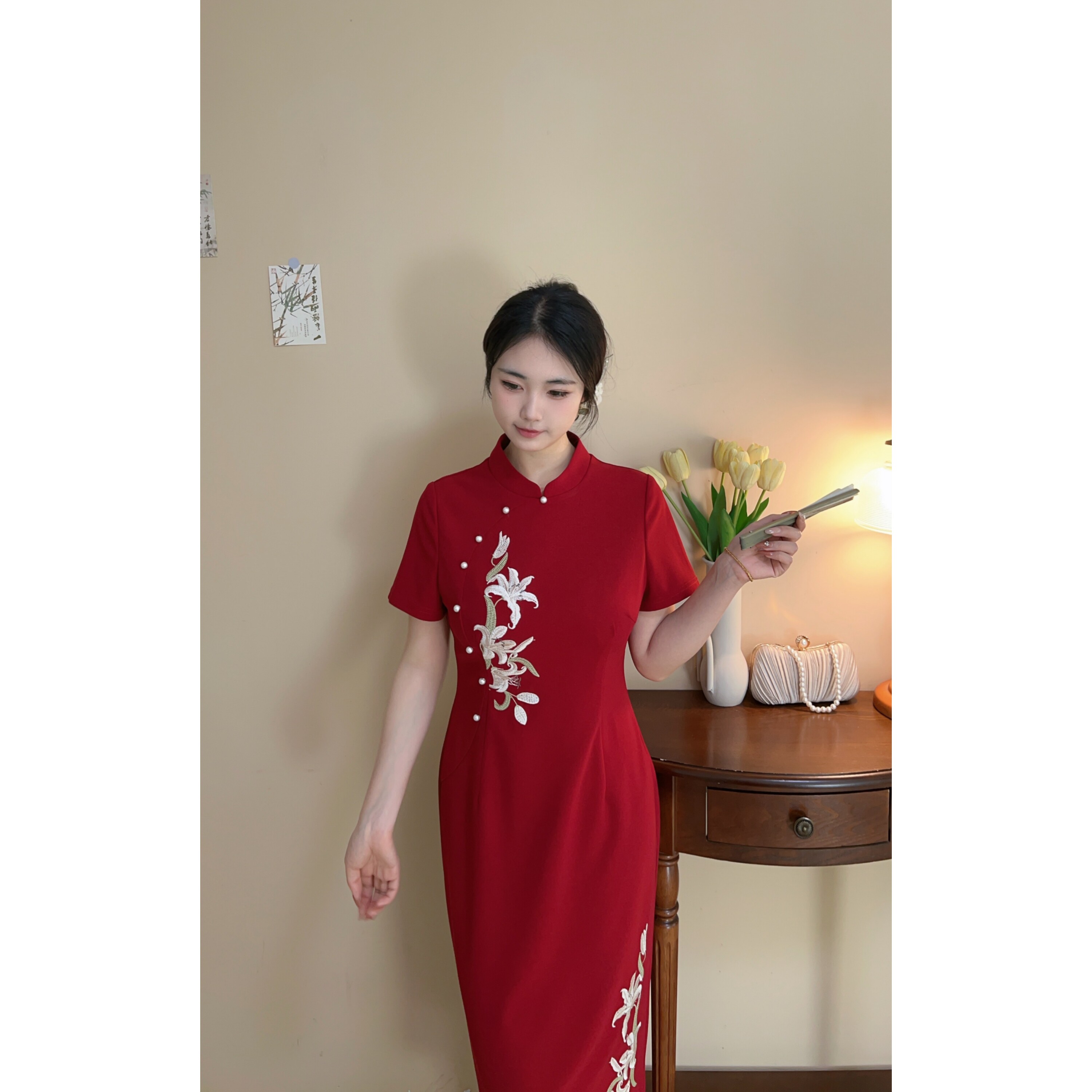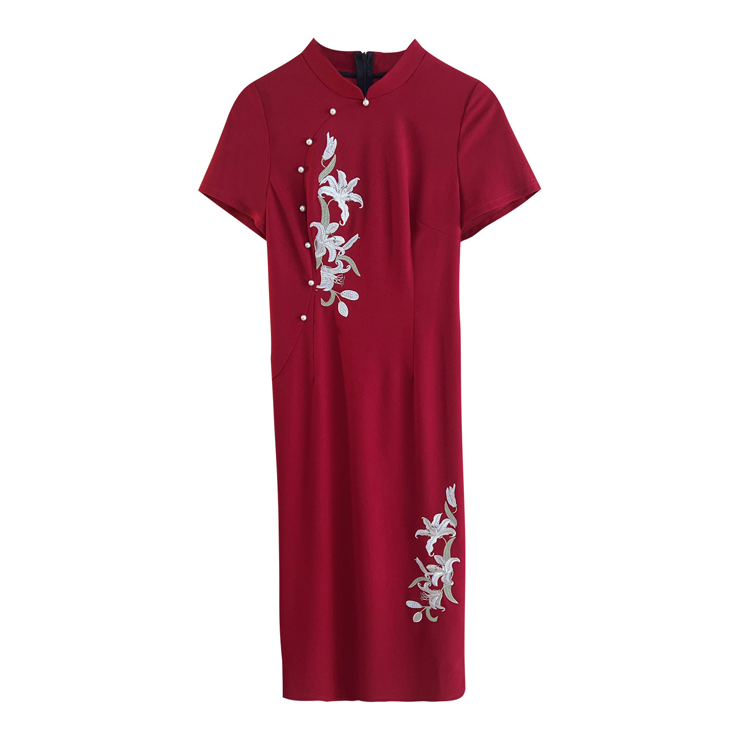 红百合【自制款】新中式红色旗袍大码胖mm订婚敬酒服长连衣裙刺绣