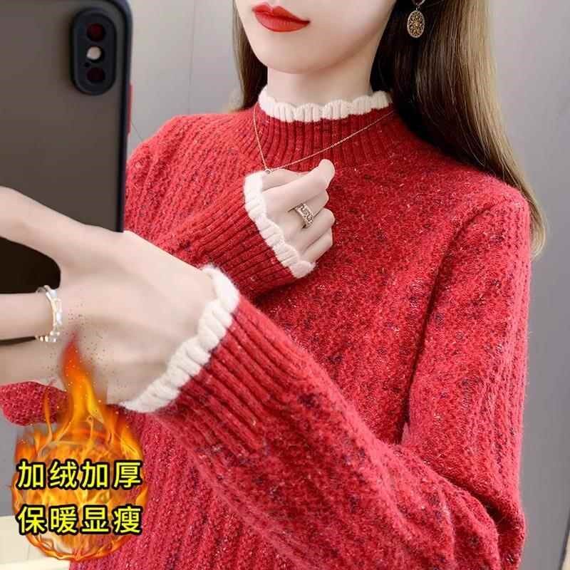 半高领加绒加厚毛衣女秋冬宽松内C搭可外穿针织打底衫初中生上衣