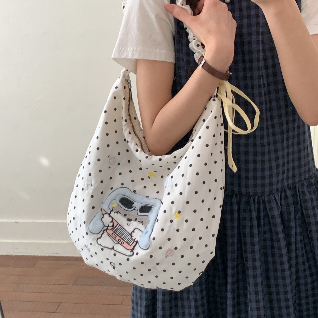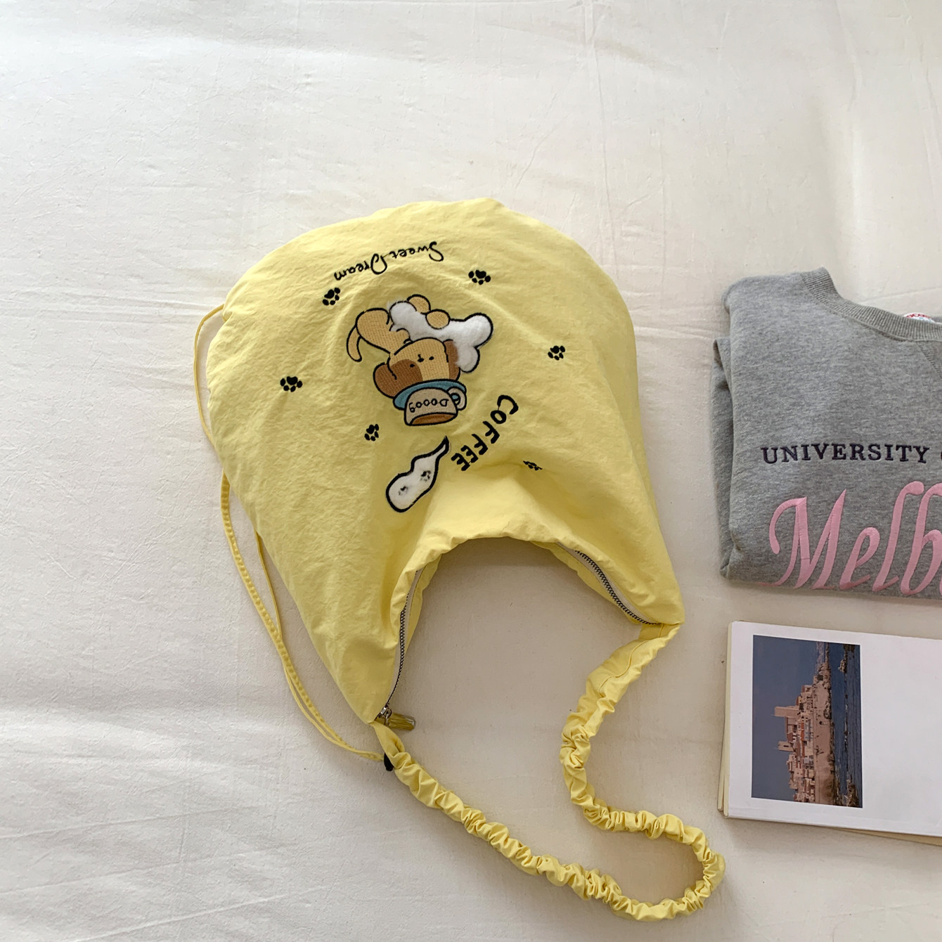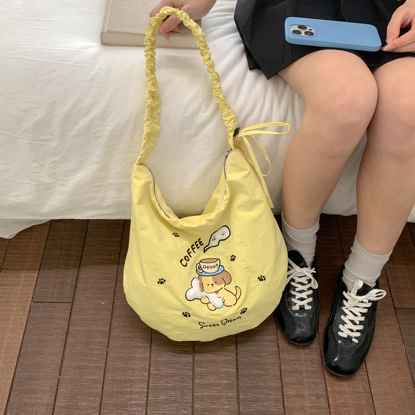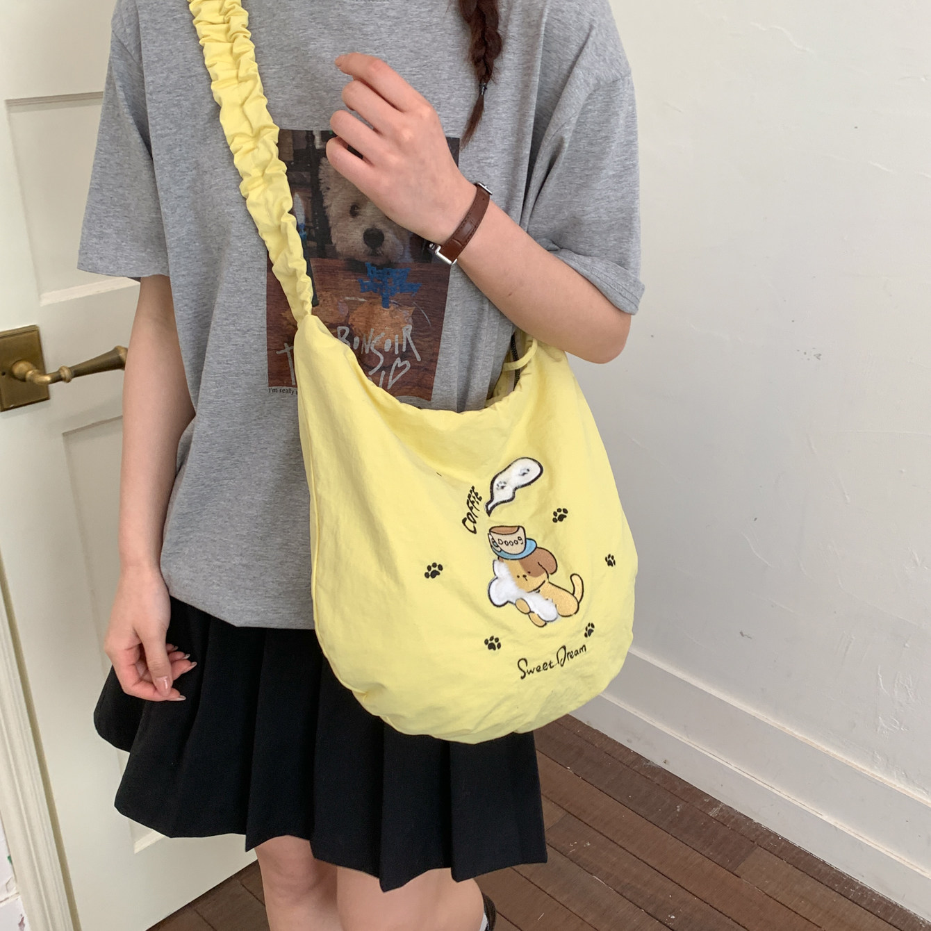 可爱小狗刺绣斜挎包包女韩系慵懒风轻便带拉链帆布包大容量托特包