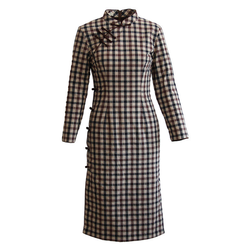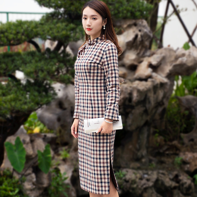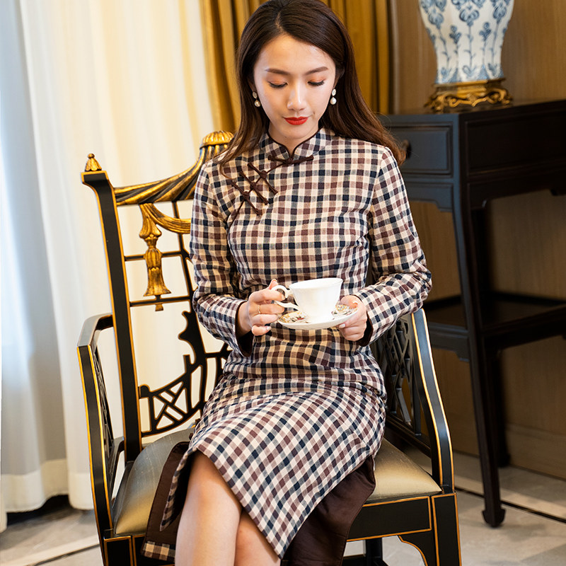 格子旗袍冬款加厚夹棉改良连衣裙中长款冬天旗袍裙民国风长袖旗袍