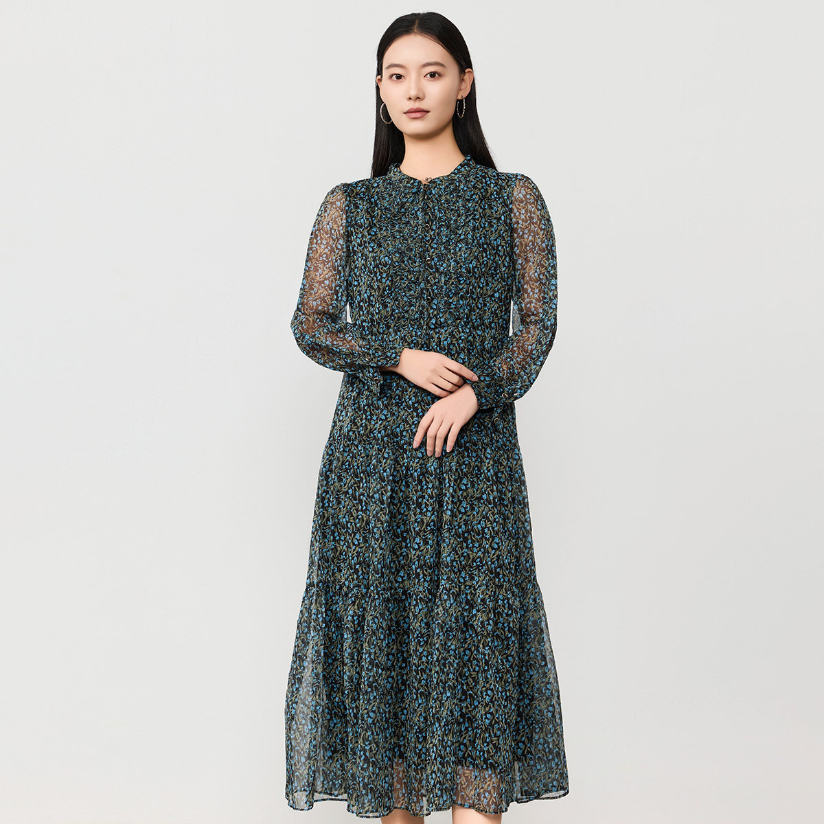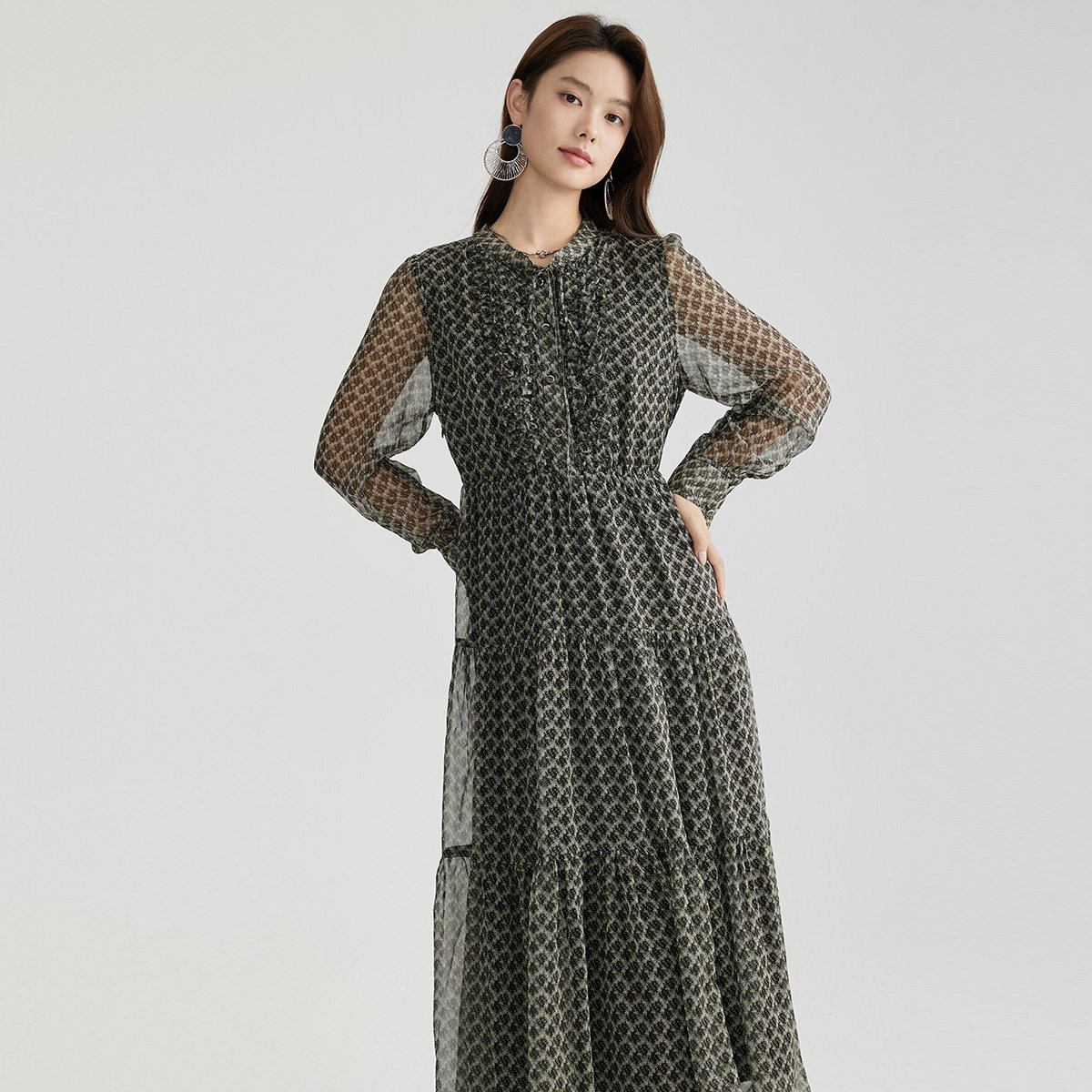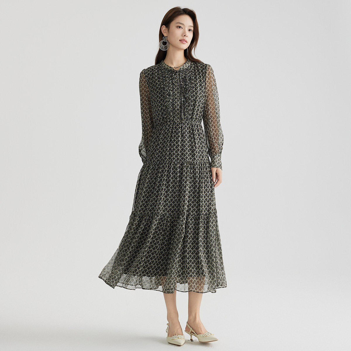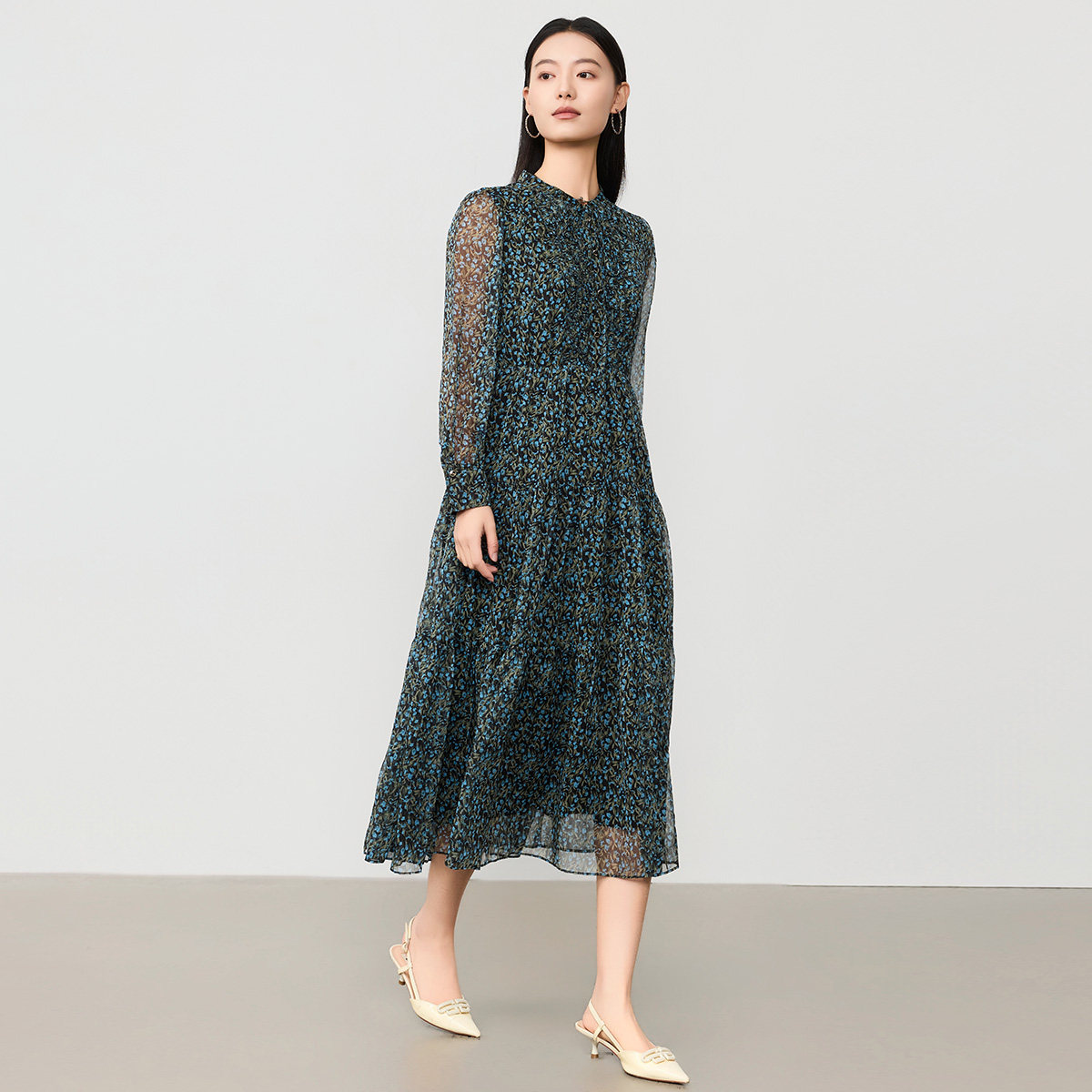 谷邦法式印花长袖连衣裙女2026春季新款收腰A字长裙气质显瘦裙子