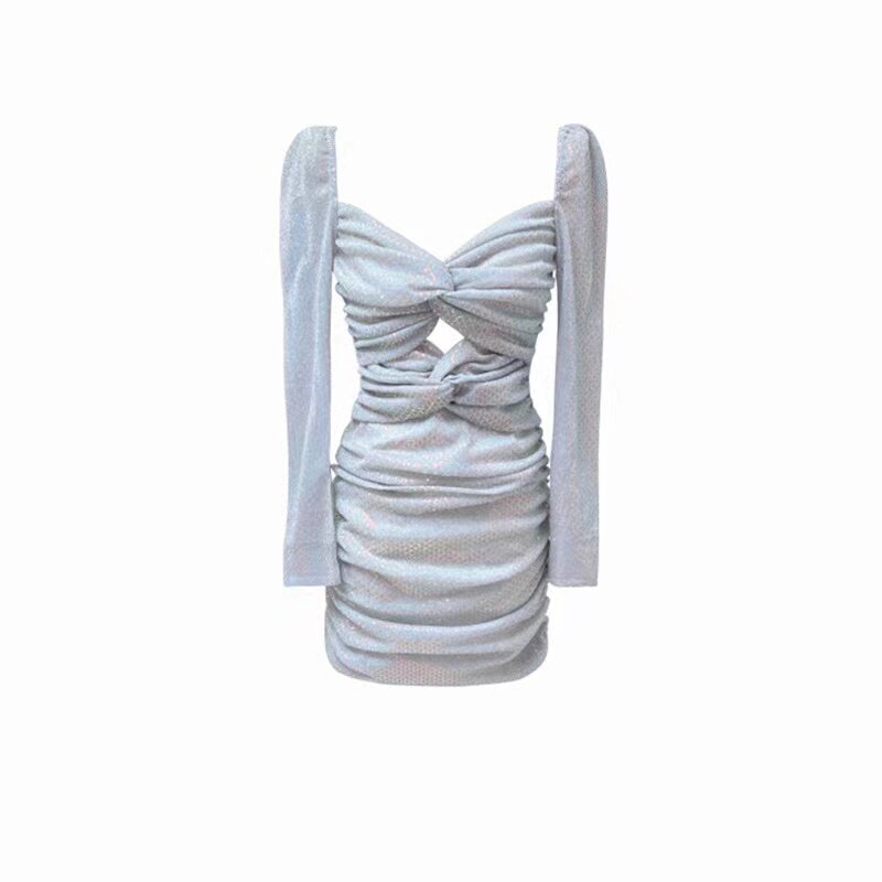 高级感亮片蓝色v领扭结连衣裙性感包臀短款裙子长袖修身褶皱短裙