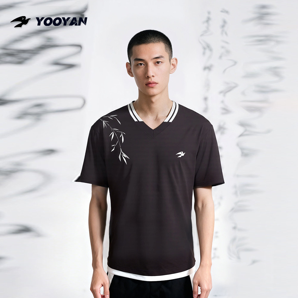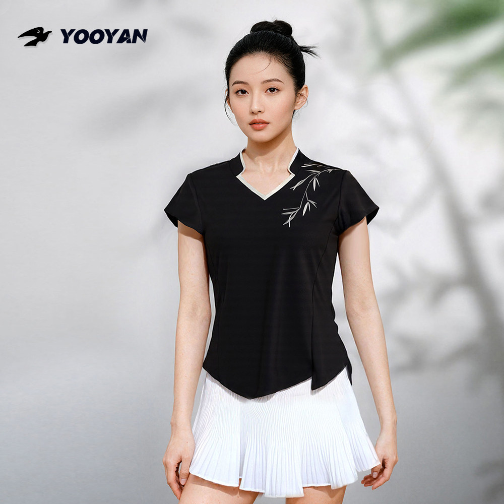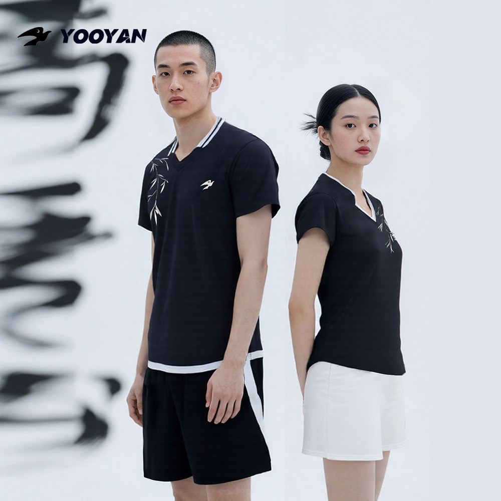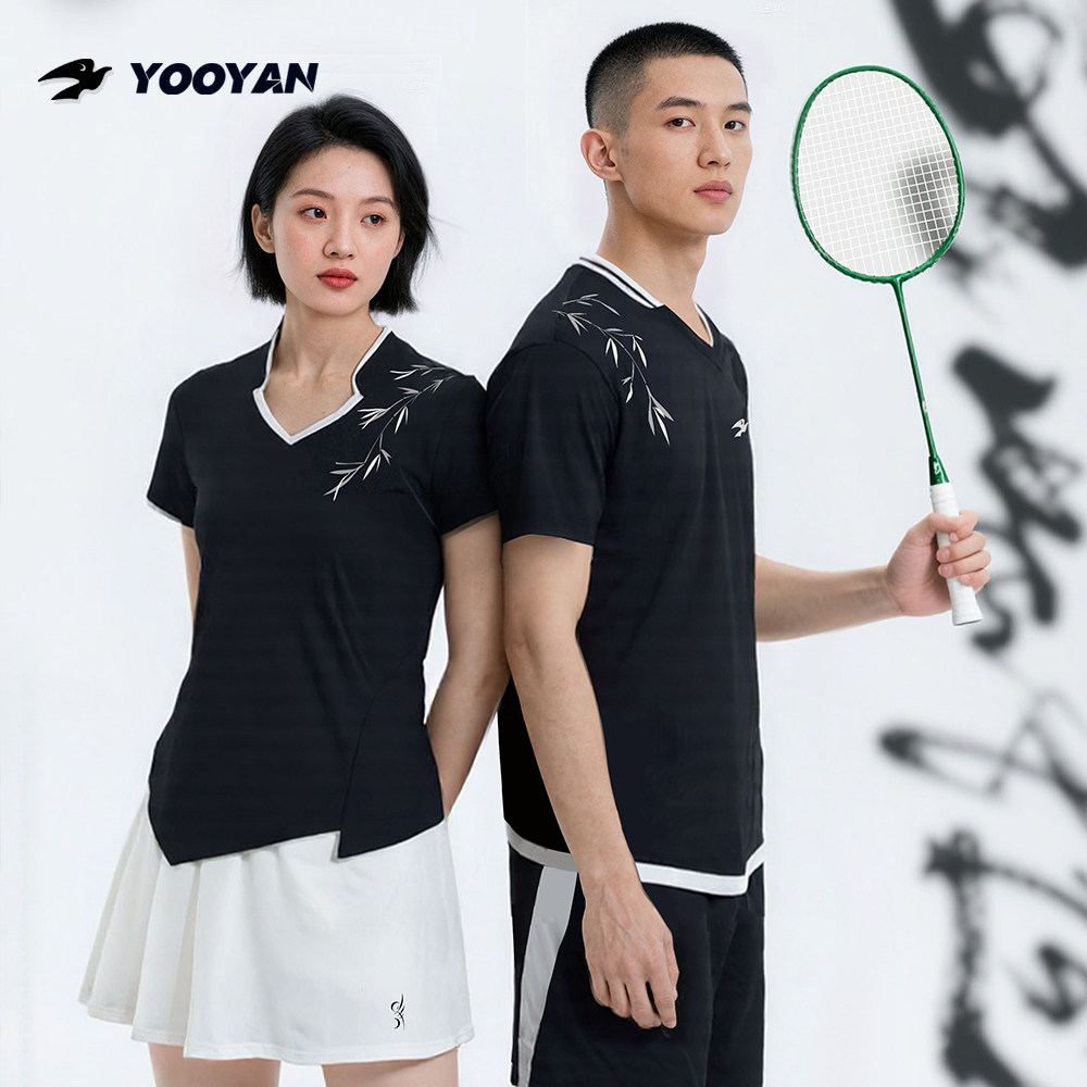 羽盐 竹影新中式羽毛球服运动套装显瘦短袖小V领大赛服上衣男女款