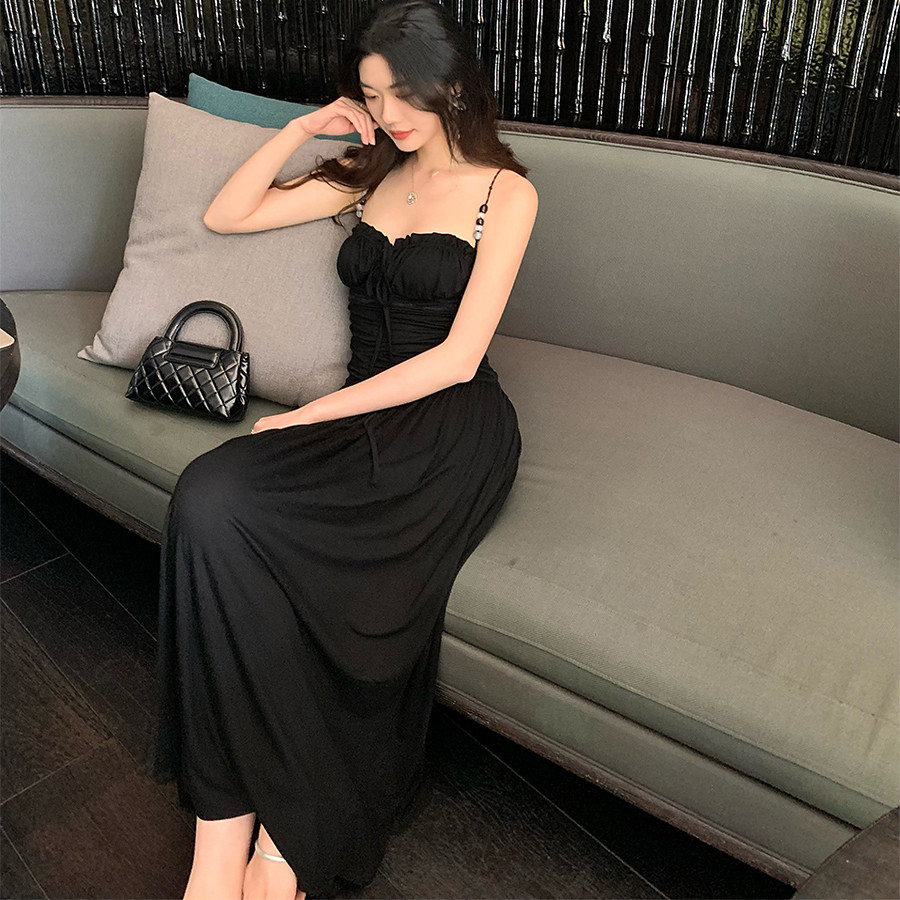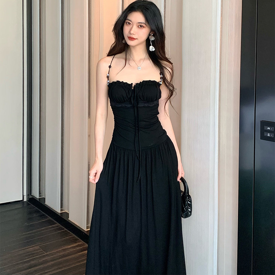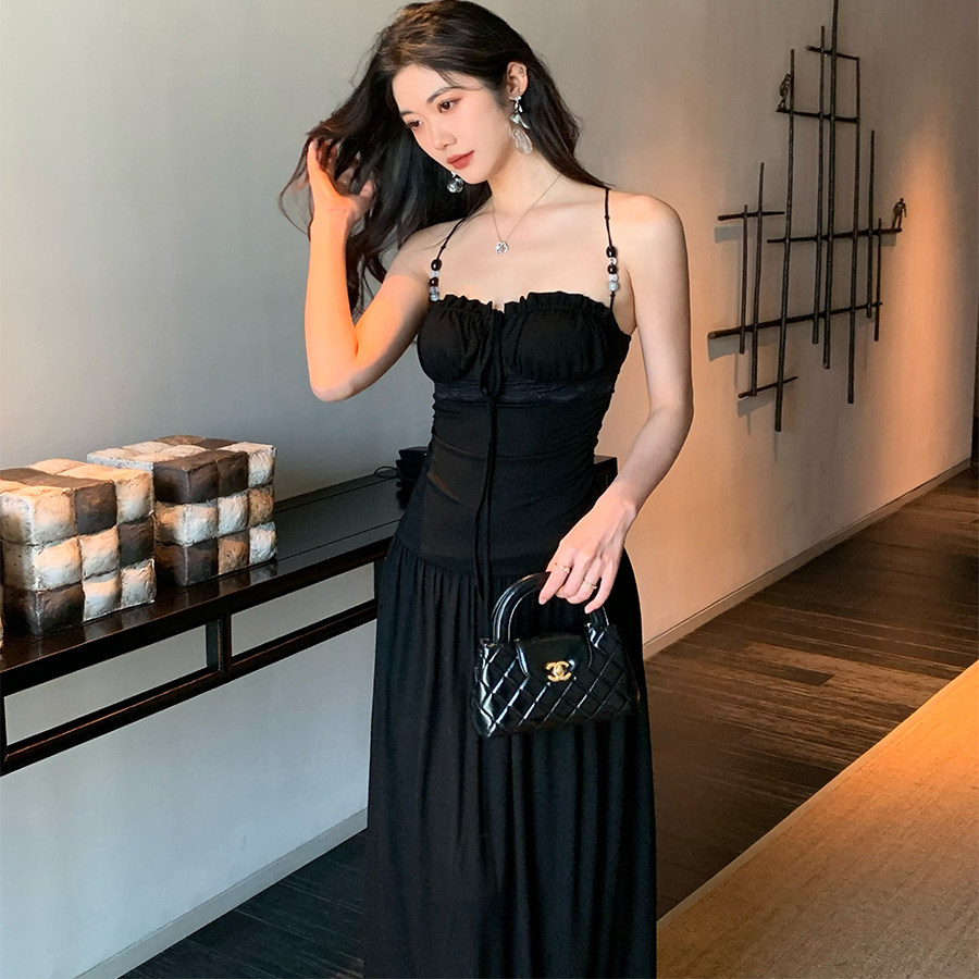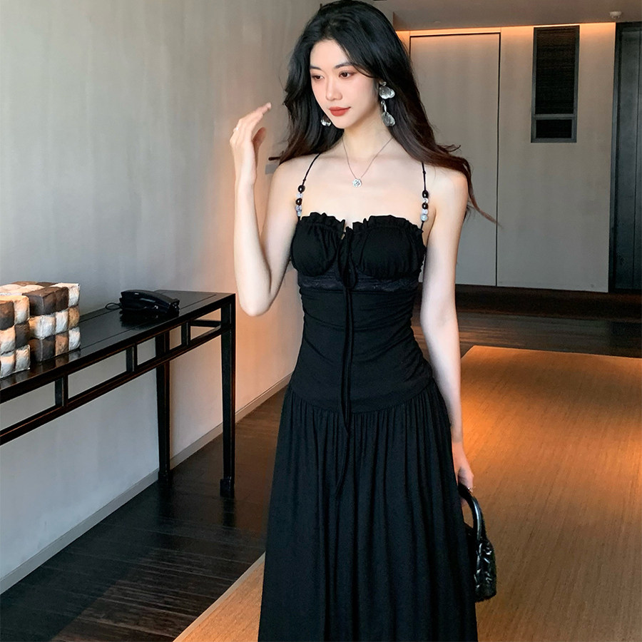 Norain不下雨 黑色蕾丝串珠花边收腰长款吊带连衣裙女夏度假裙