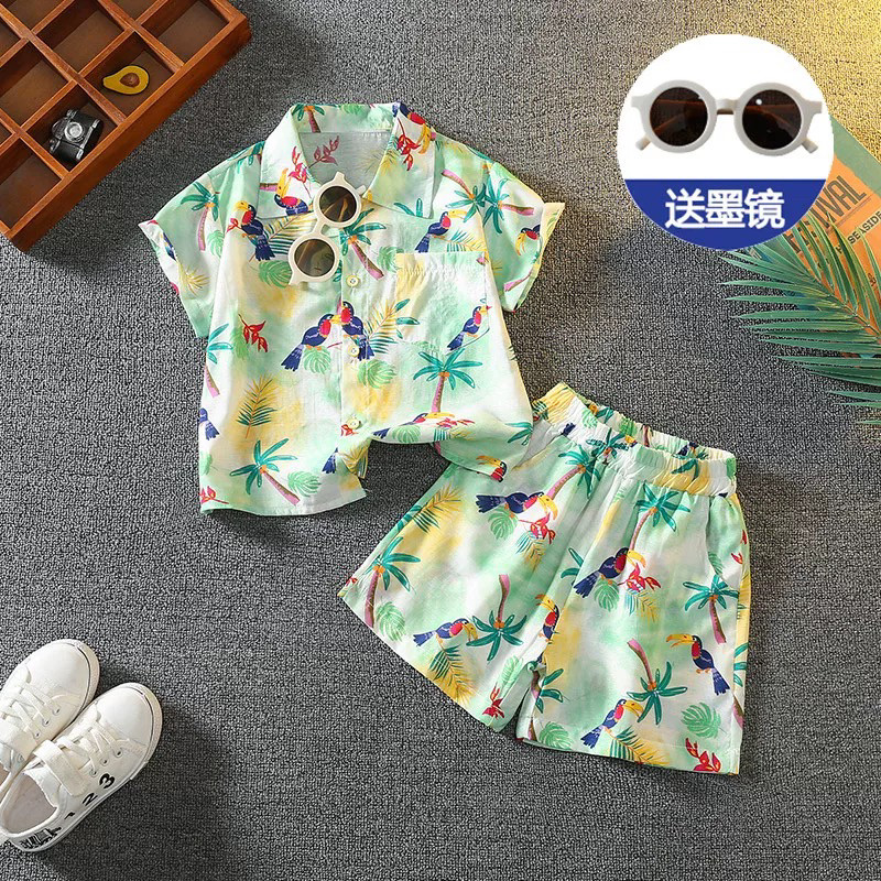 男童夏季沙滩短袖套装2026新款儿童旅游度假夏威夷岛服宝宝花衬衫