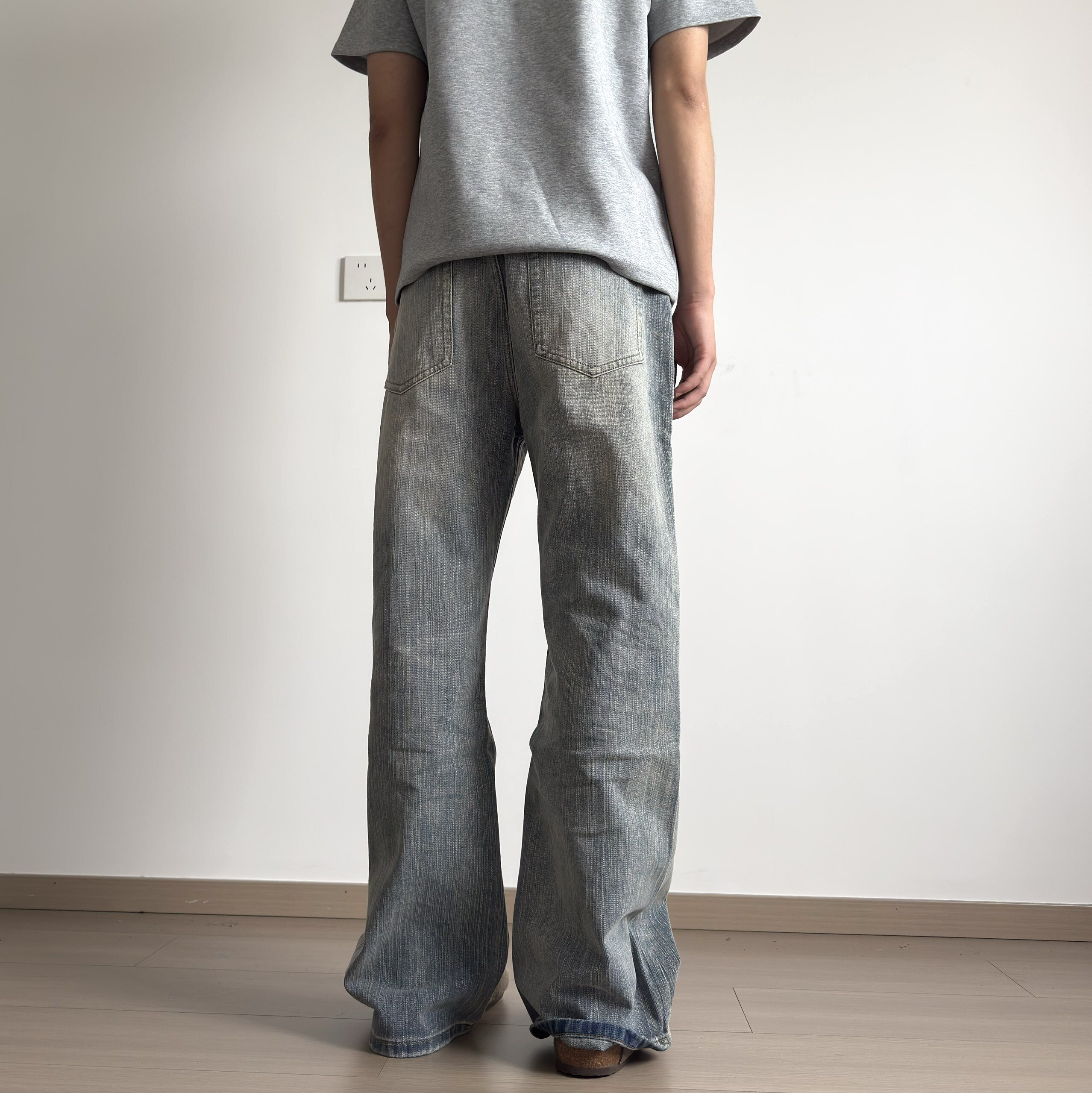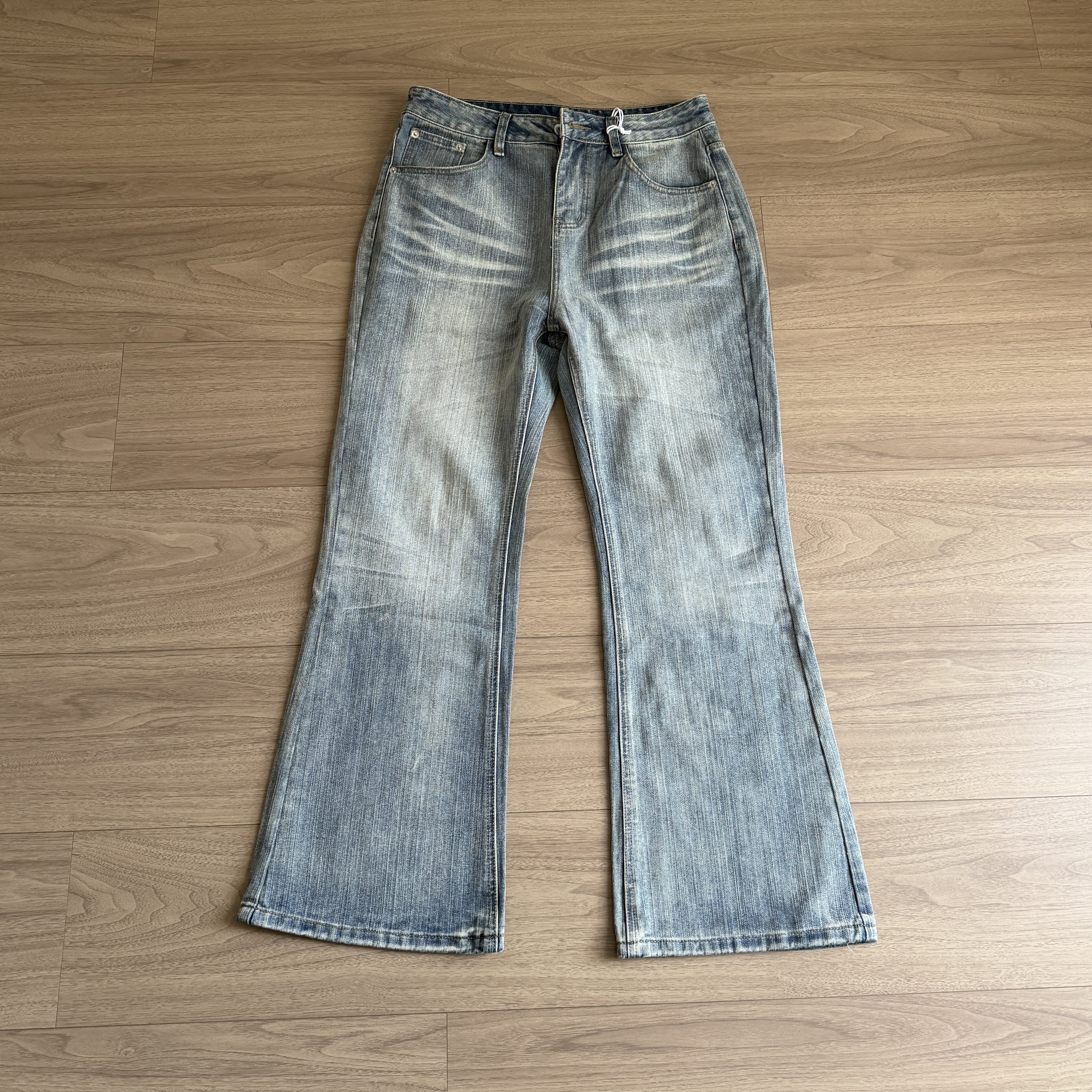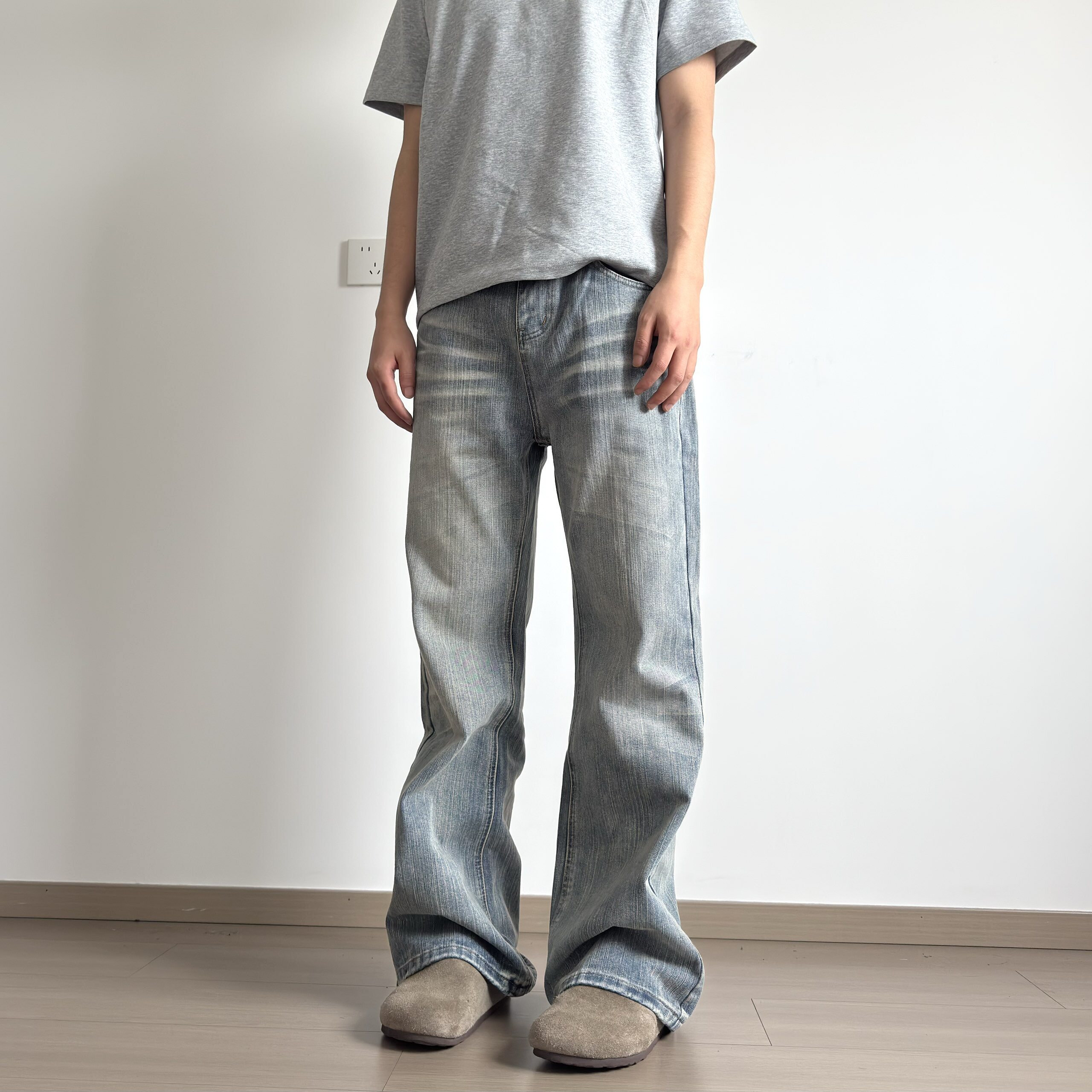 soxiox窄幅竹节纹浅蓝色微喇牛仔裤男女款美式直筒修身不贴腿裤子