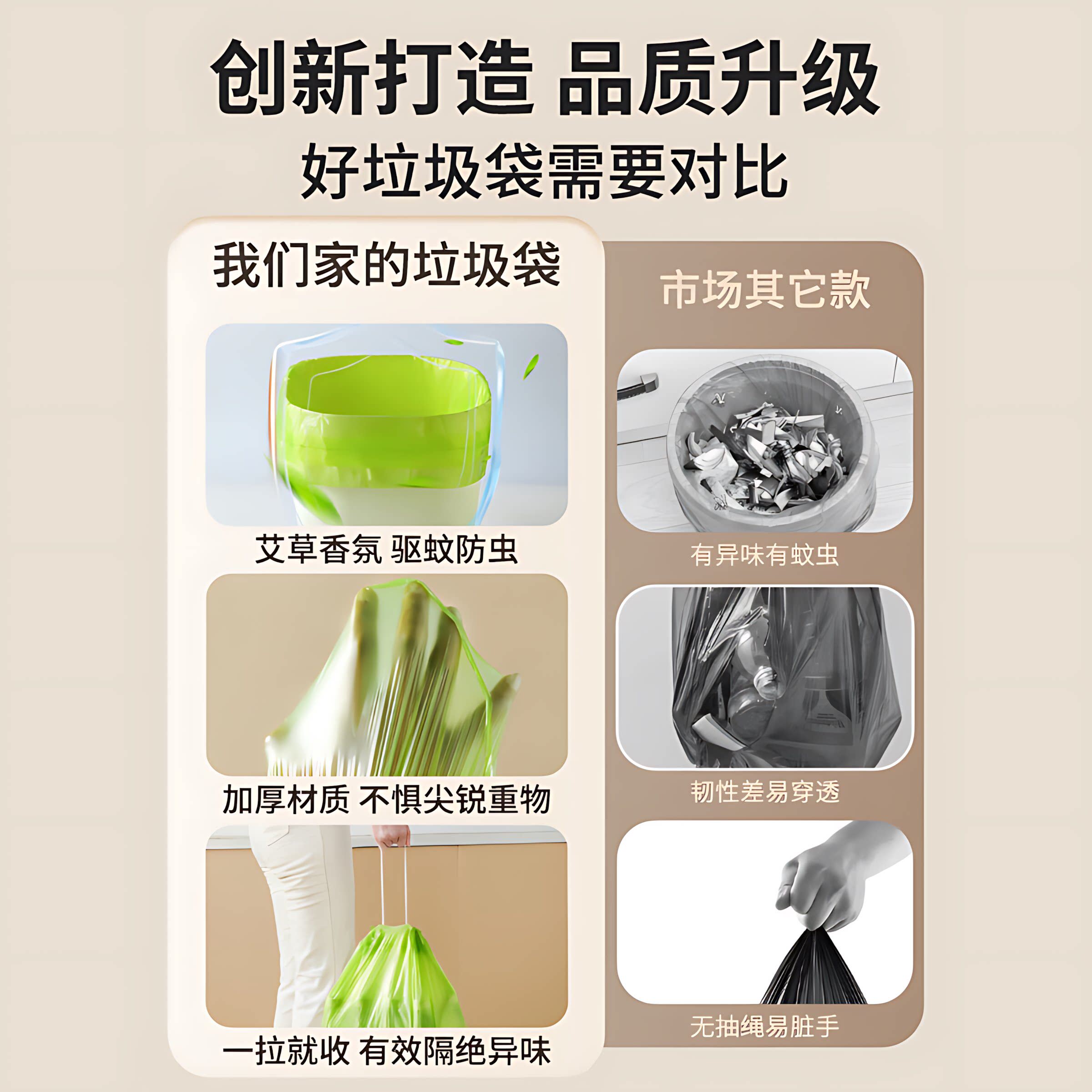 艾草垃圾袋防臭家用加厚手提式抽绳厨房专用耐用大卷塑料袋不易破
