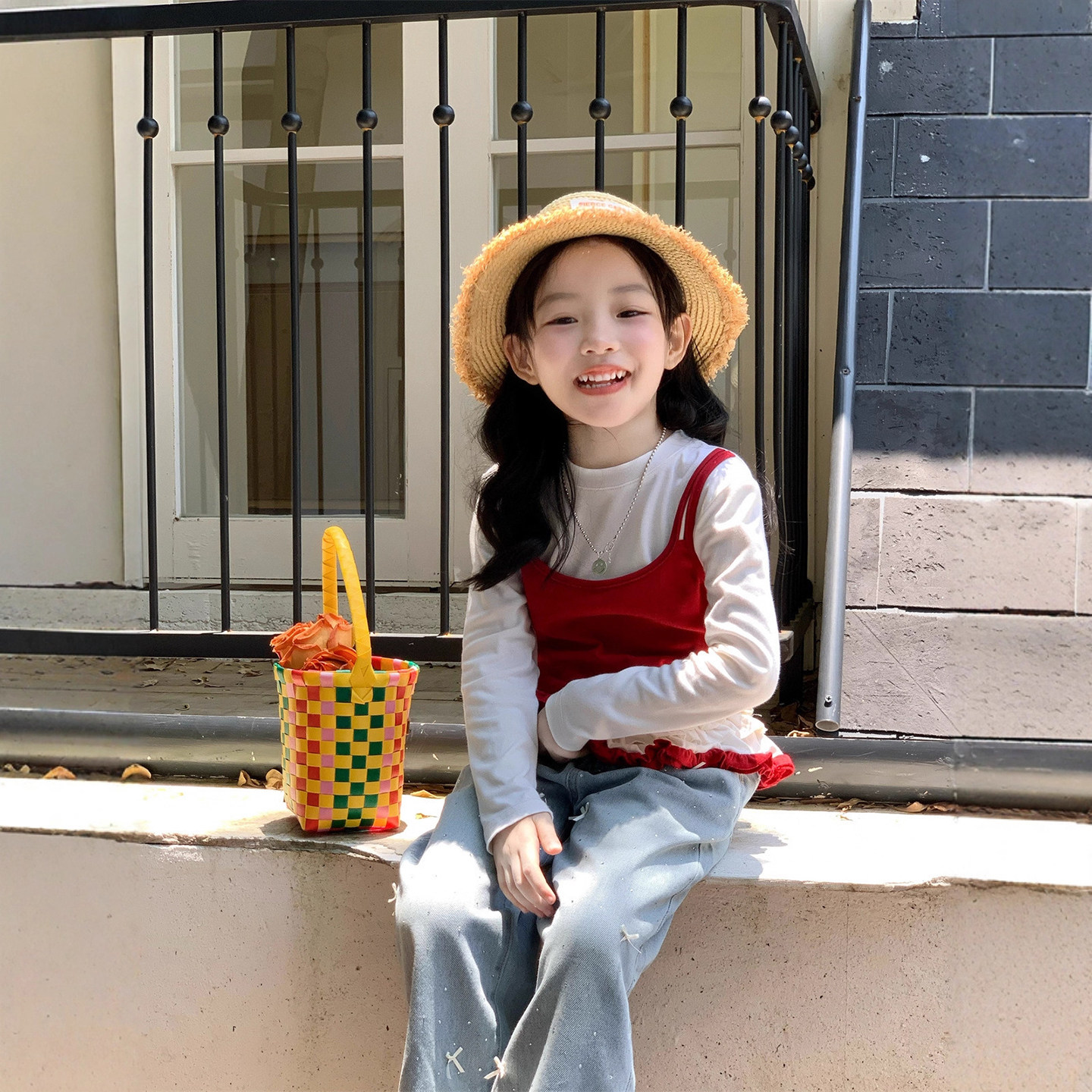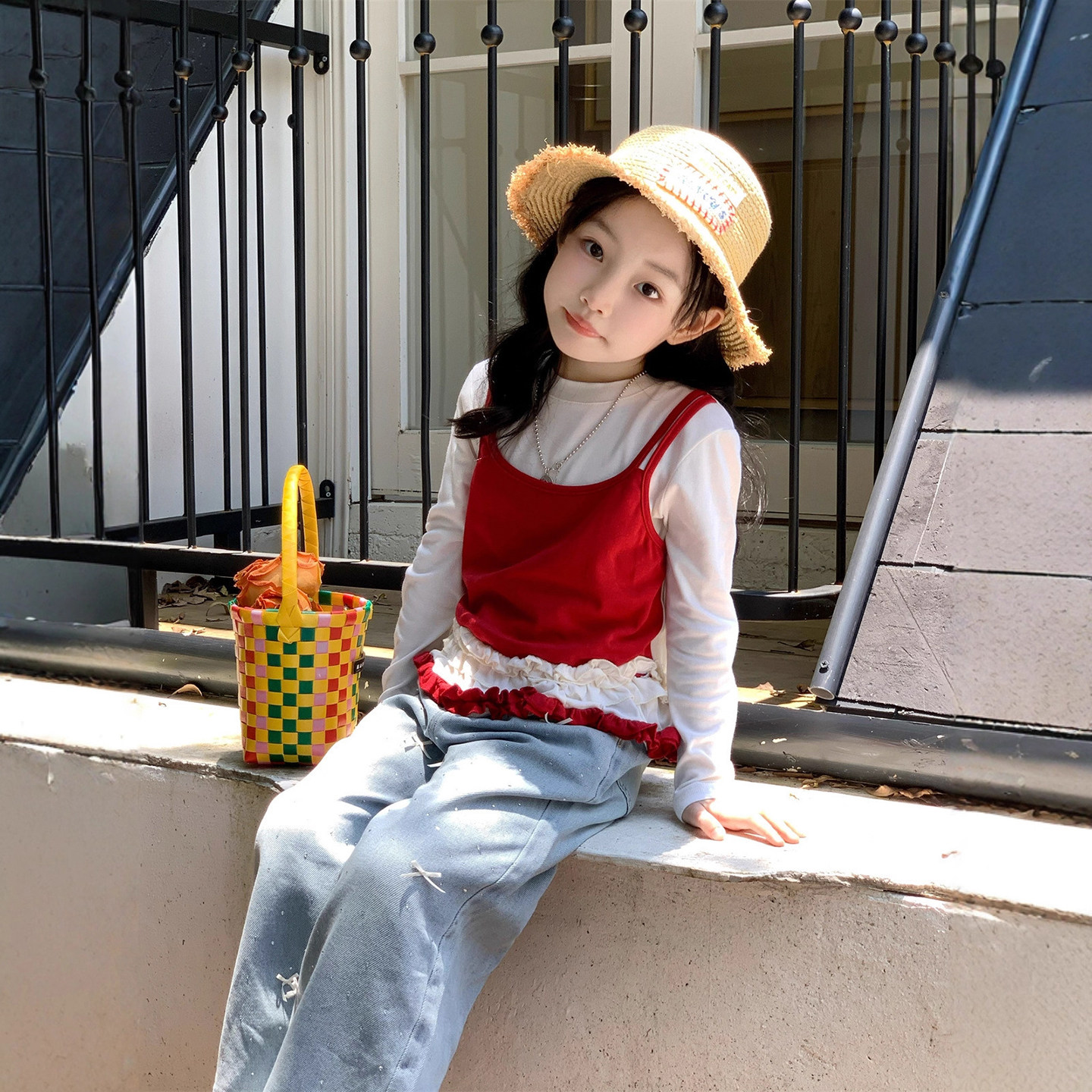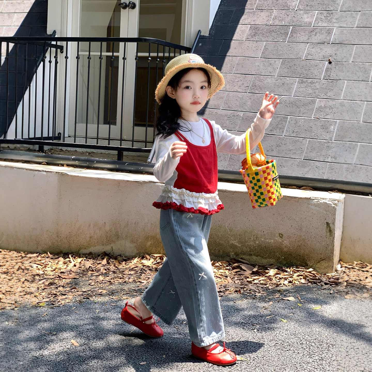 女童长袖t恤2026新款春装儿童宝宝夏季假两件木耳边上衣牛仔裤子