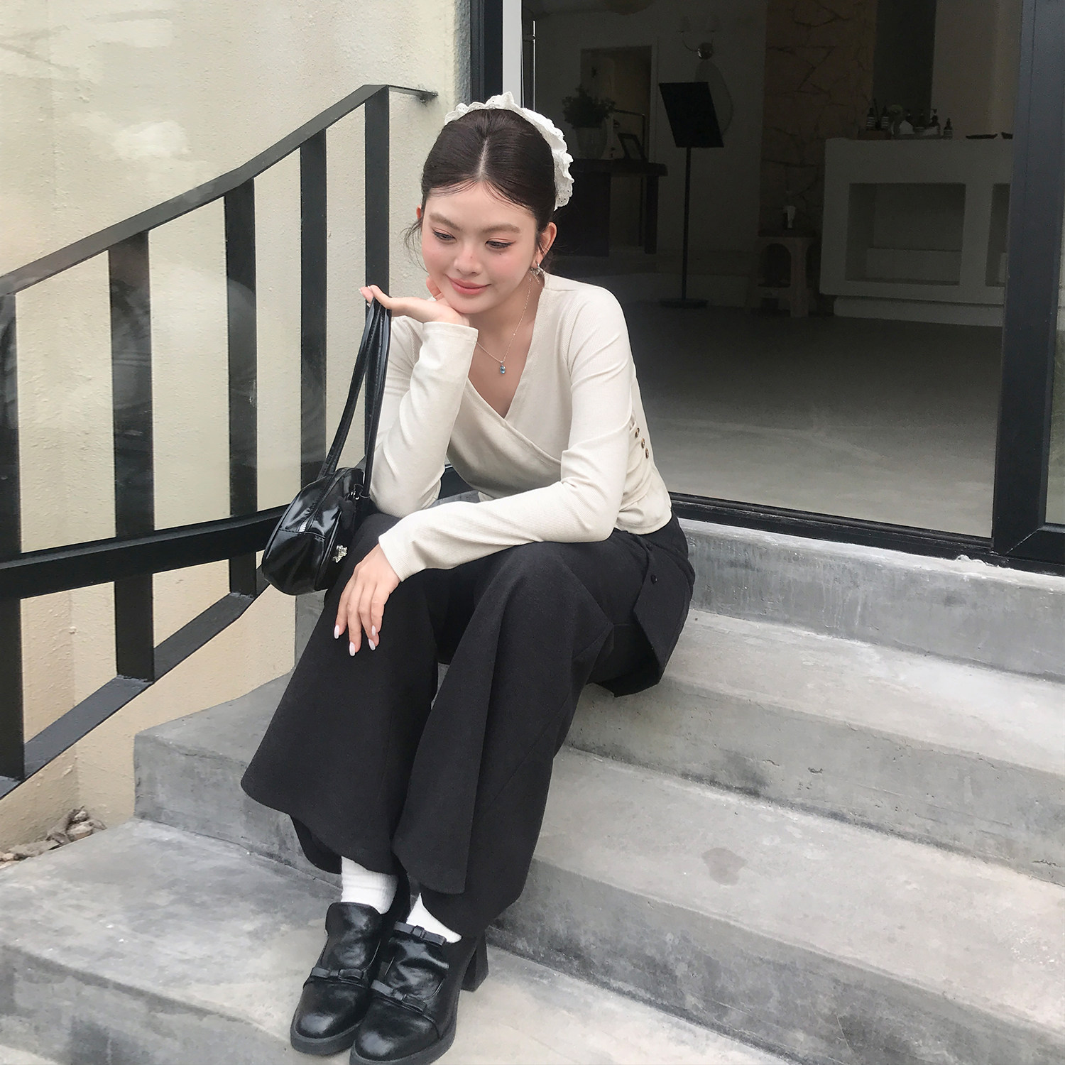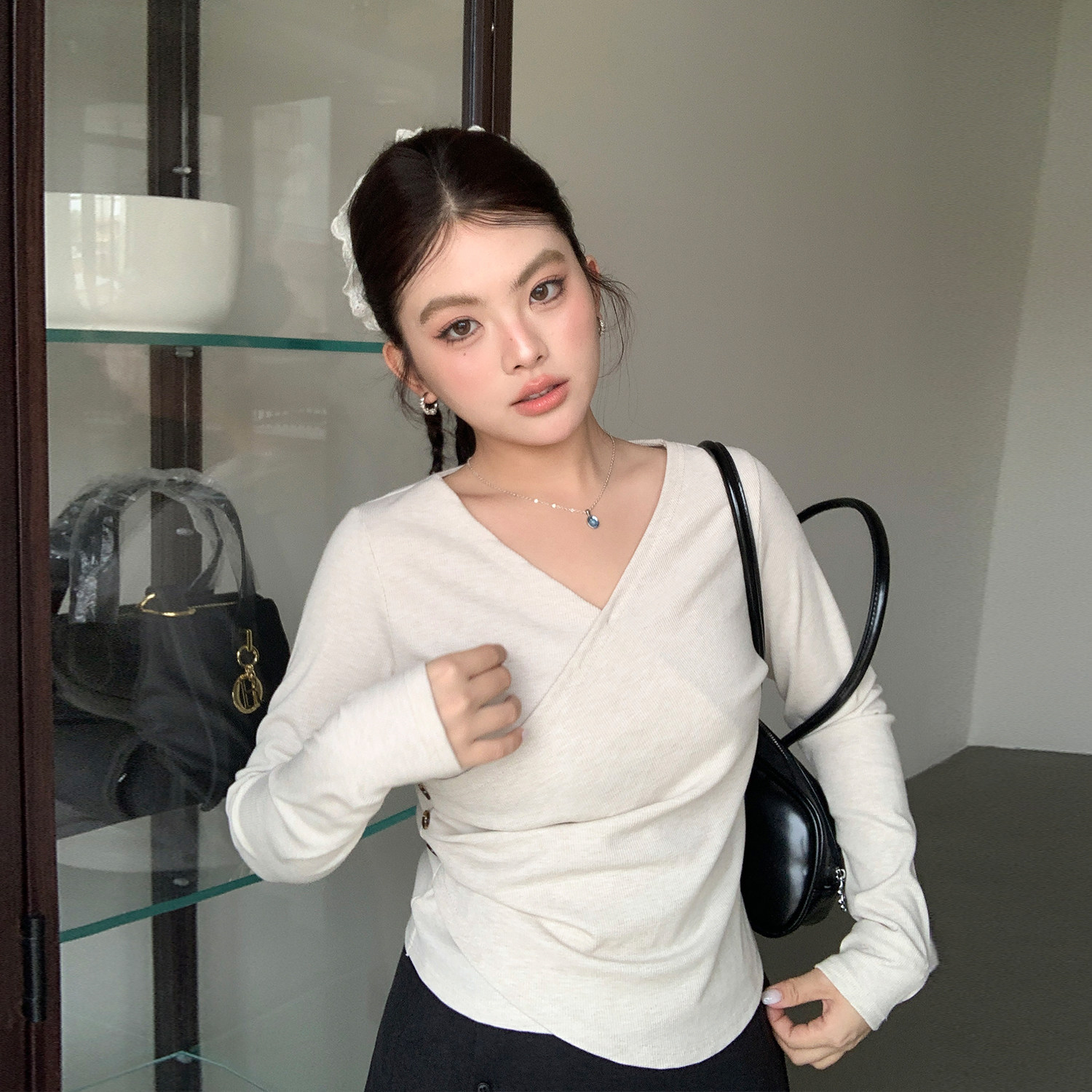 春款2026新款大码女装v领收腰显瘦上衣微胖女生穿搭设计感长袖t恤