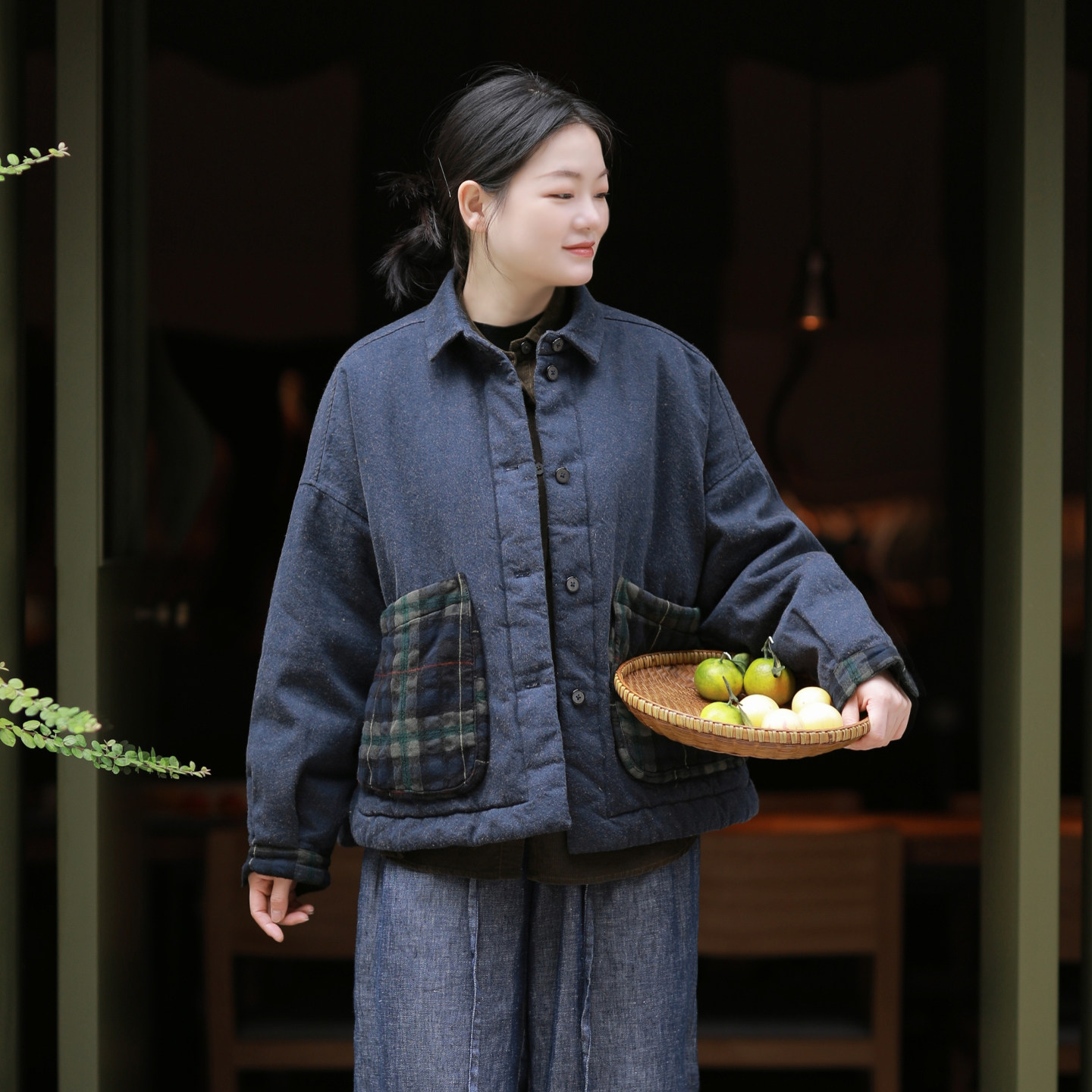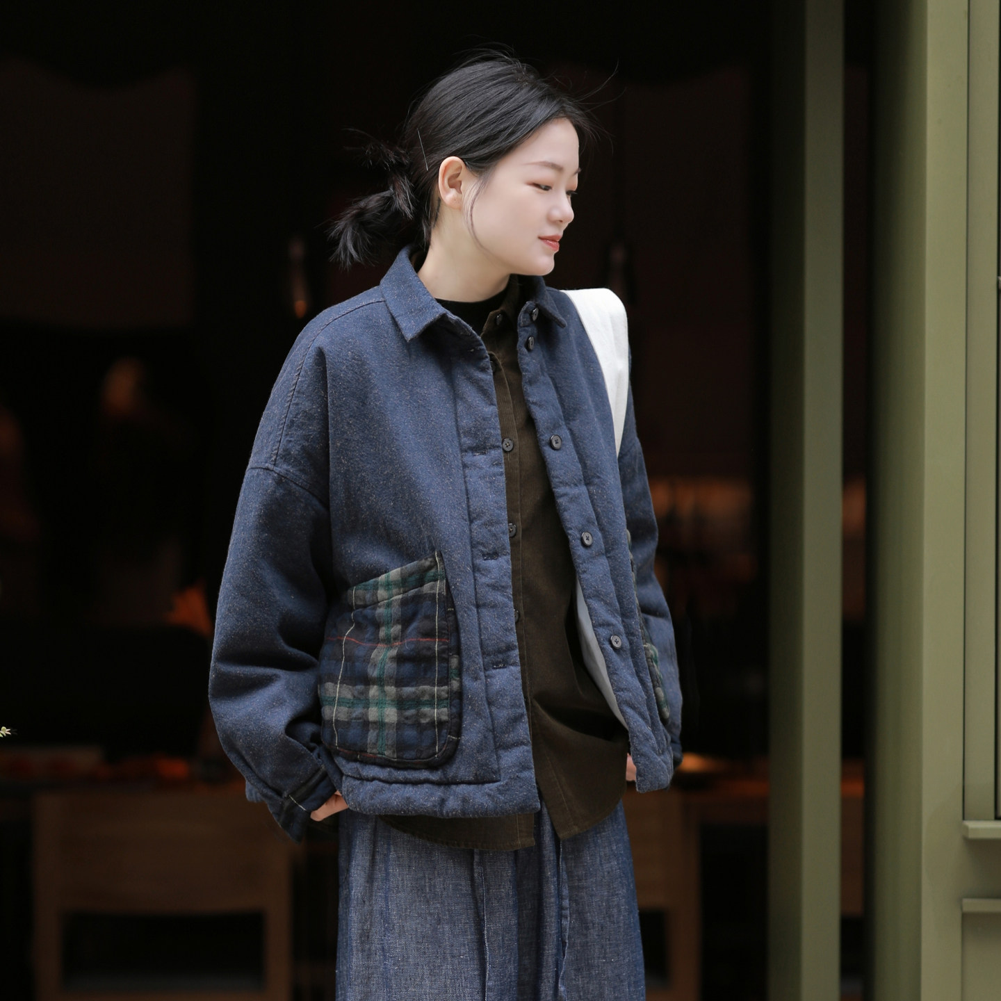 古石后原创布衣棉服女款2025新款冬棉麻大码宽松翻领加厚夹棉外套