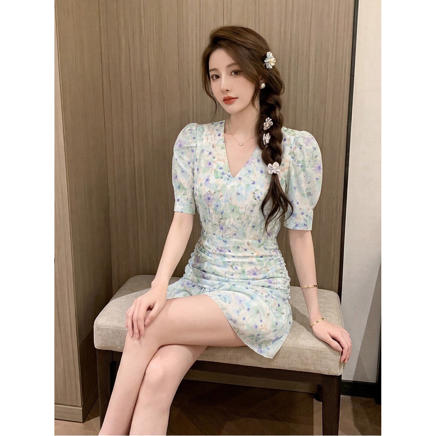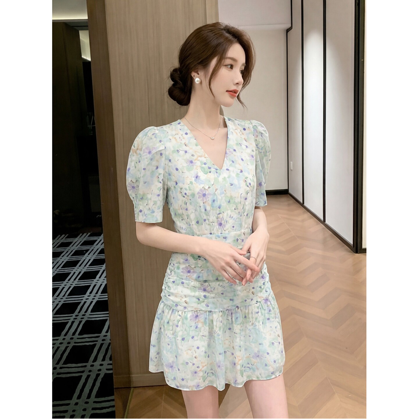 奢华2026夏季新款韩版温柔系显瘦修身小个子穿搭浅绿色碎花连衣裙