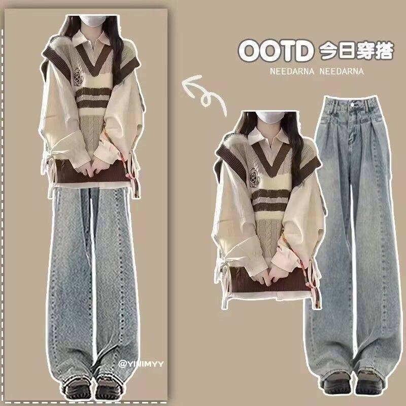 女童秋装2025新款春秋洋气时髦套装衬衫马甲女孩学院风牛仔裤三件