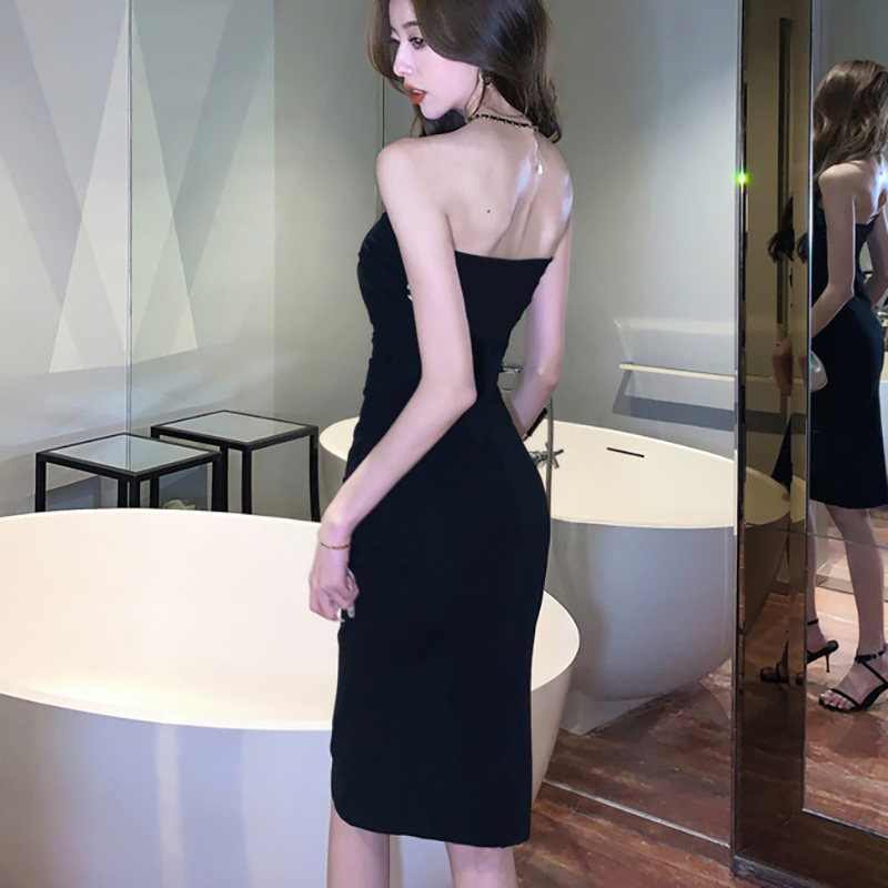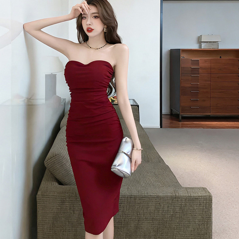 带胸垫抹胸连衣裙女无袖吊带修身包臀性感气质高级感中长款裙子棉