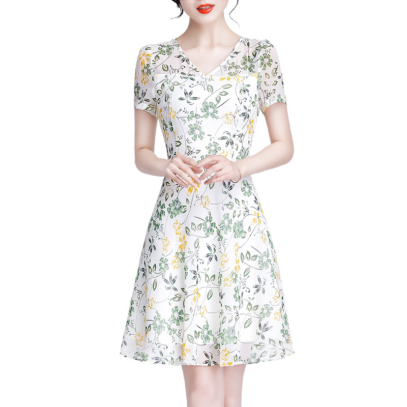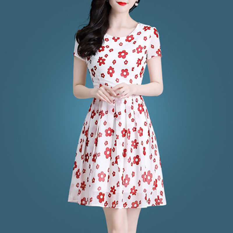 夏天连衣裙女夏装2026新款短袖大码收腰显瘦气质减龄印花碎花裙子