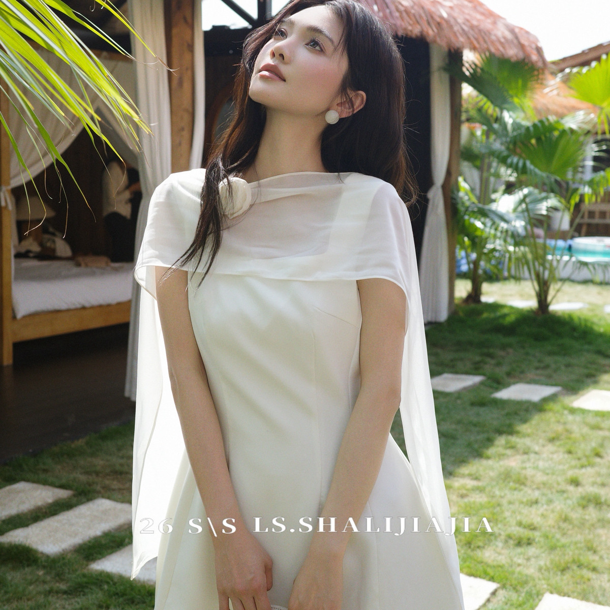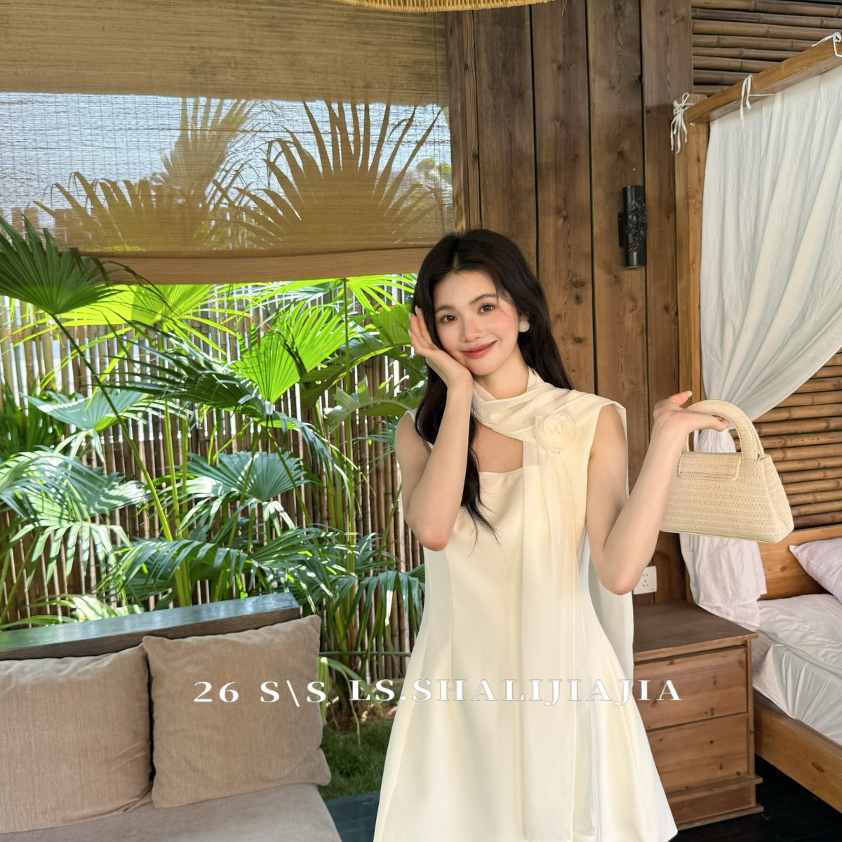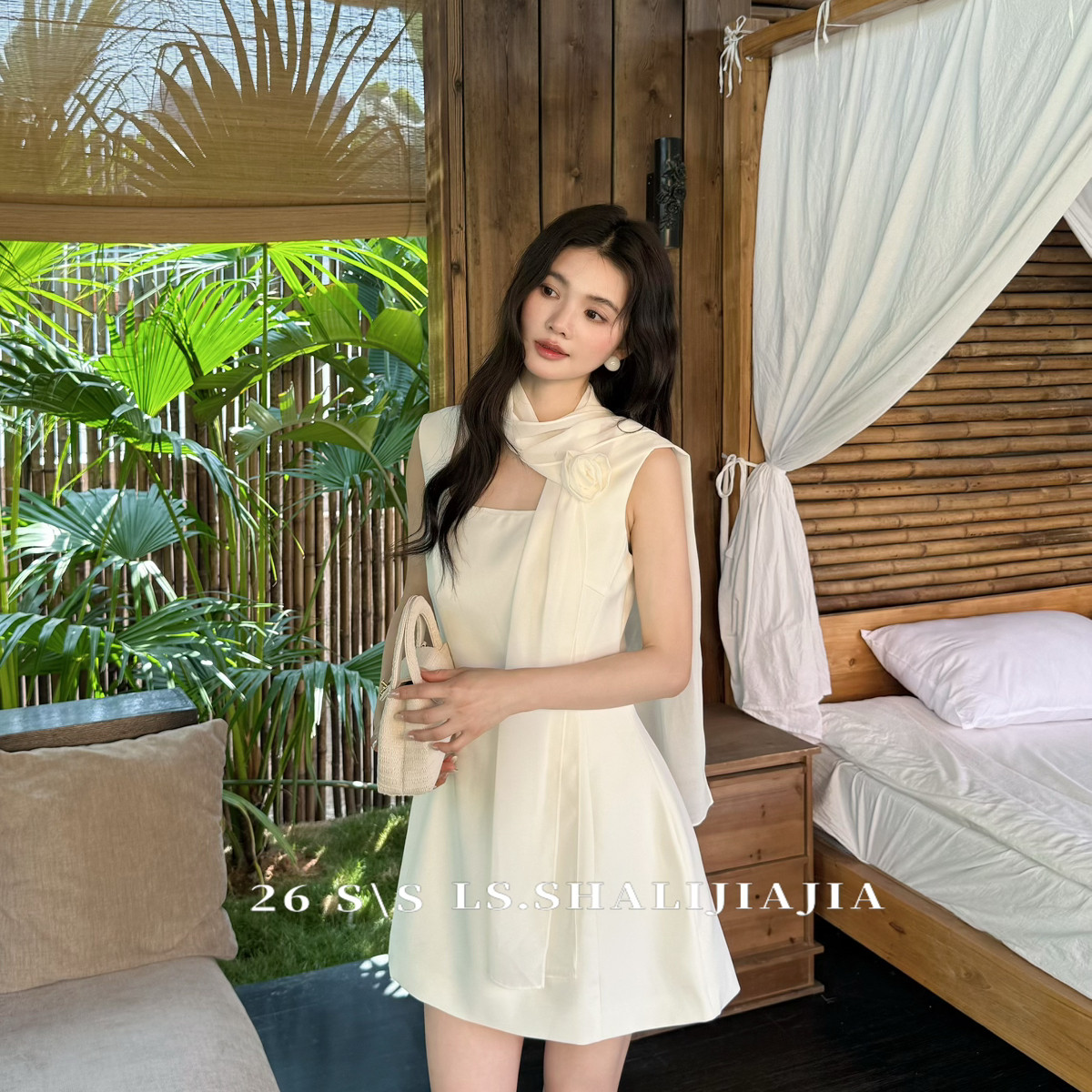LS-26春夏上新法式优雅气质无袖方领背心收腰短款连衣裙(配飘带)