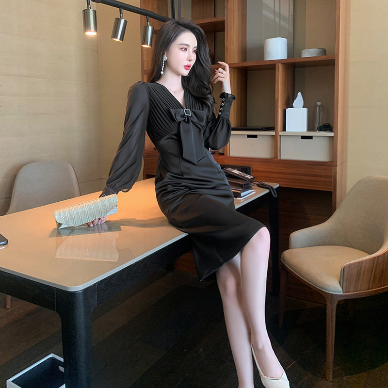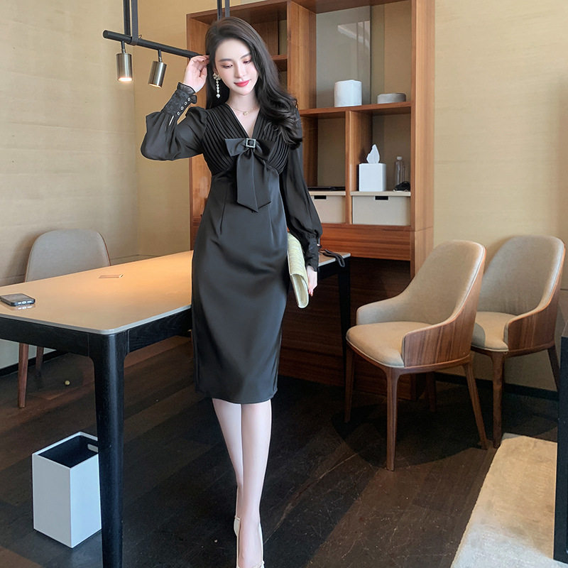 2026秋冬新款赫本风黑色蝴蝶结V领收腰长袖连衣裙减龄优雅晚礼服