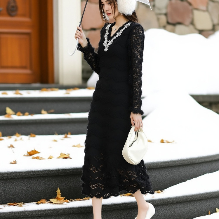 大码胖mm法式复古蕾丝连衣裙女黑白色长袖收腰显瘦气质高级感长裙