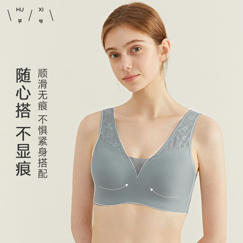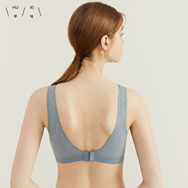 乎兮V领隐孔印花美背蕾丝聚拢胸罩性感百搭无痕内衣文胸