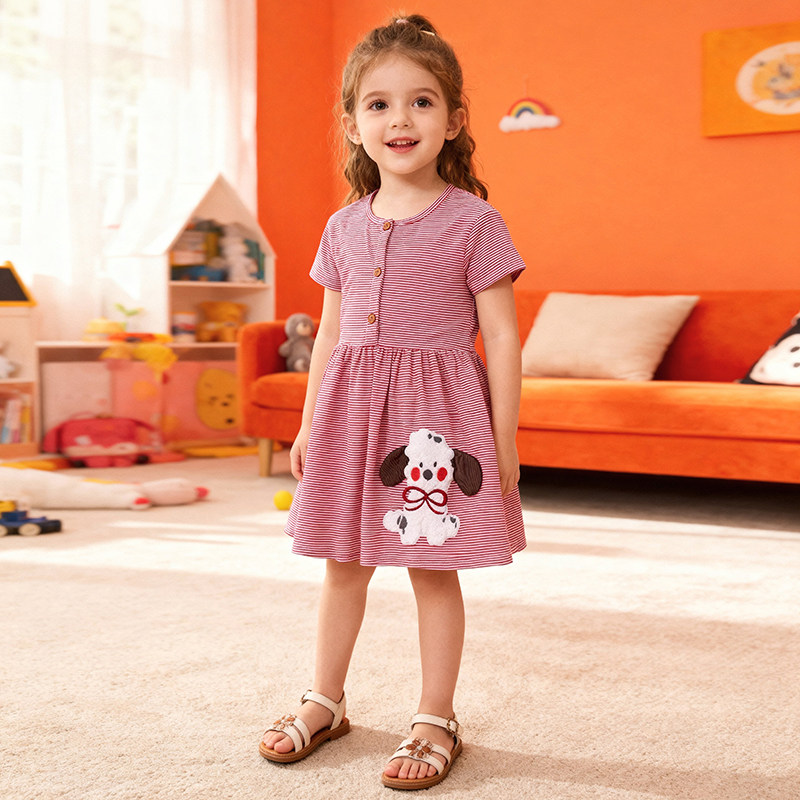 甜美风女童大红色条纹连衣裙宝宝夏季短袖小狗蛋糕裙女孩T恤裙子