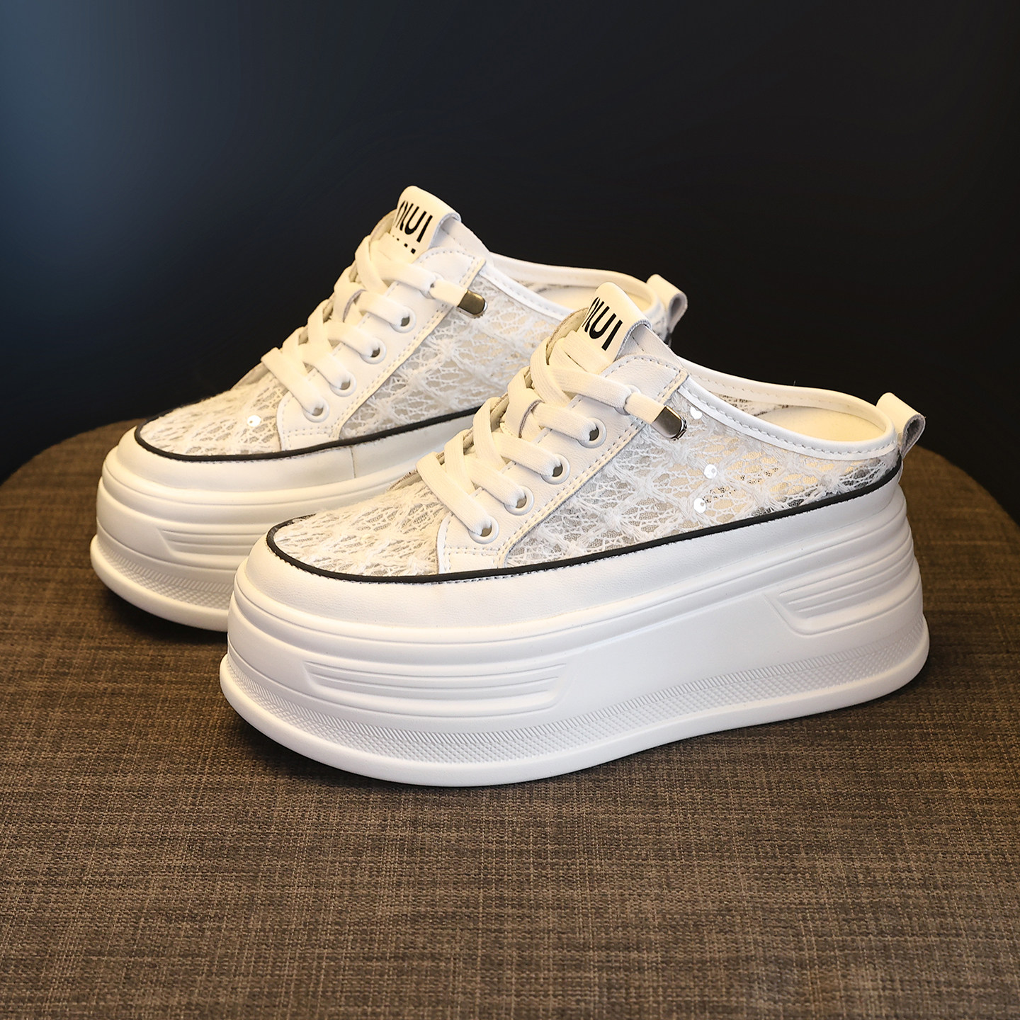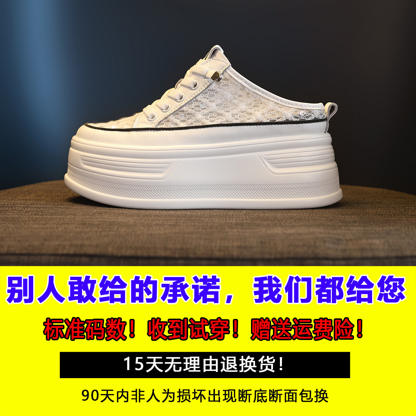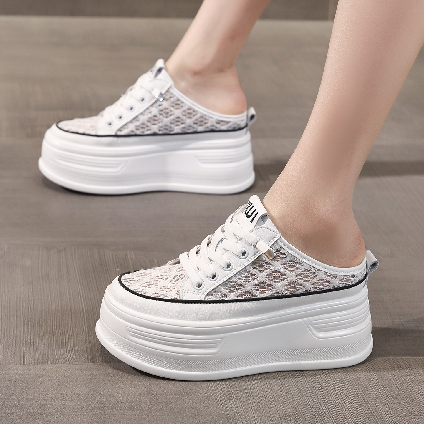 包头网面半拖鞋女2026新款百搭厚底内增高小个子一脚蹬懒人小白鞋