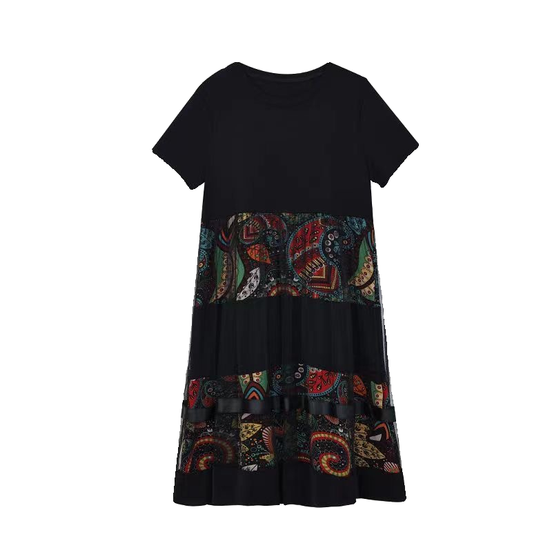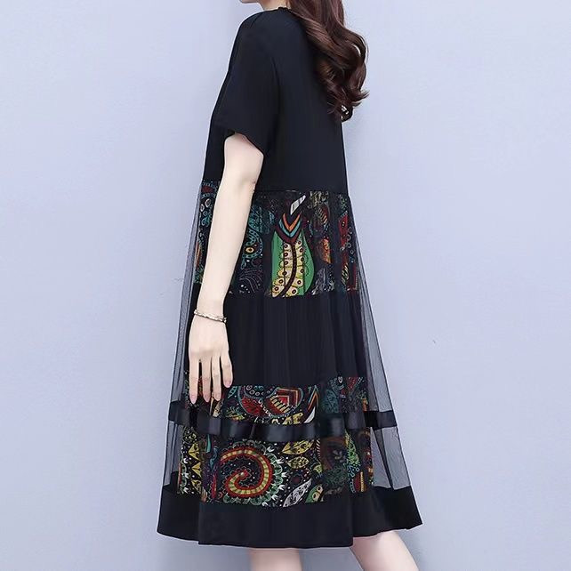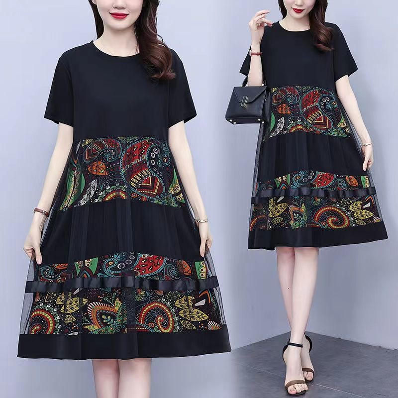 2026夏季大码女装胖mm韩版洋气遮肚印花拼接中长显瘦百搭连衣裙女