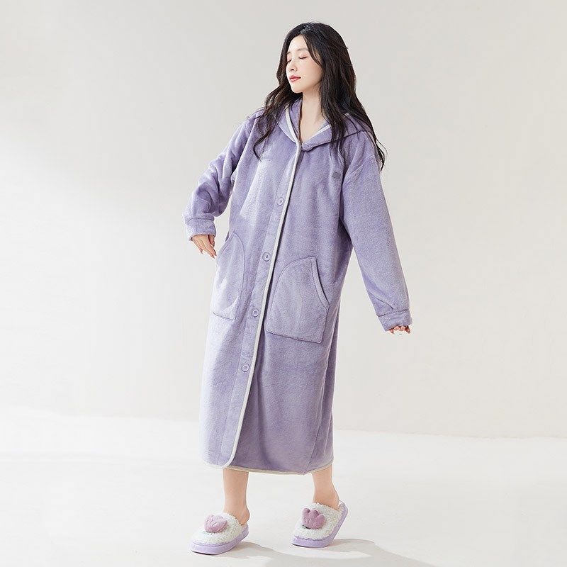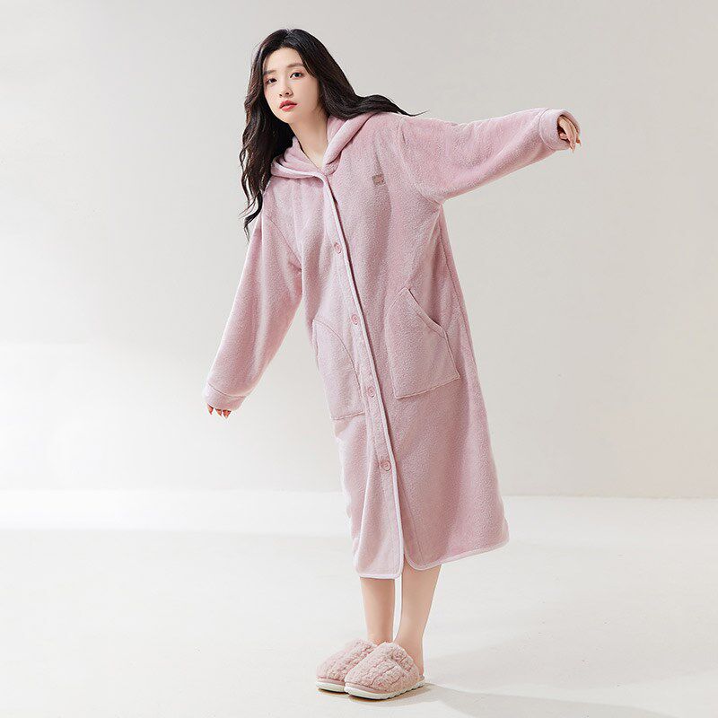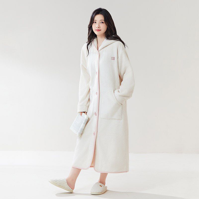 睡袍女款秋冬季加绒加厚珊瑚绒长款E连帽睡衣法兰绒白色家居服长