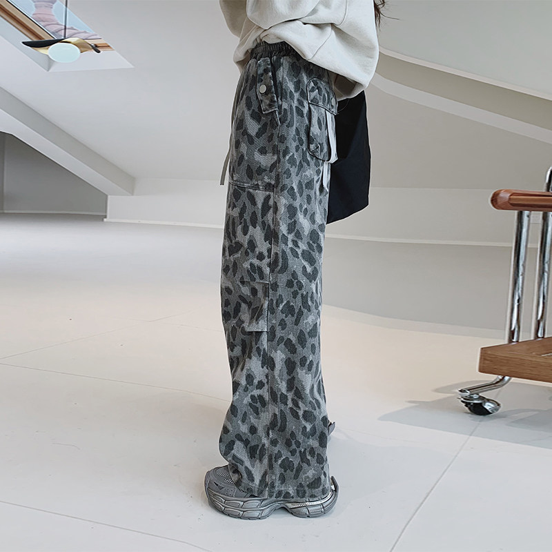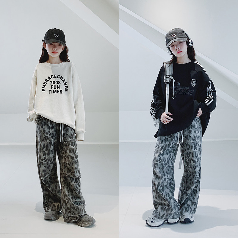 女童牛仔裤2025秋装新款女大童初中生工装豹纹裤青少年街舞长裤子