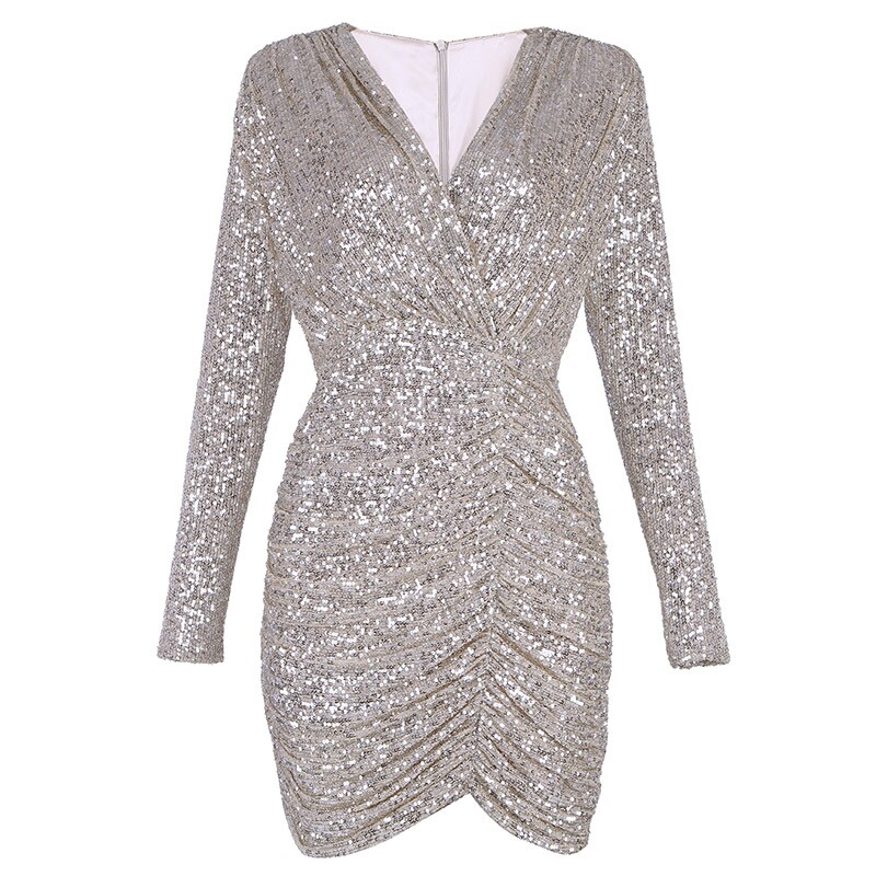 时尚高级感气质长袖短款连衣裙修身名媛轻奢亮片派对宴会晚礼服女