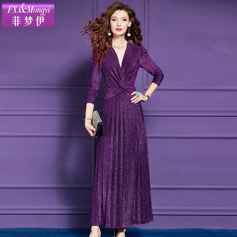 菲梦伊连衣裙女长袖春装新款法式千金风细闪高腰显瘦收腰时尚长裙